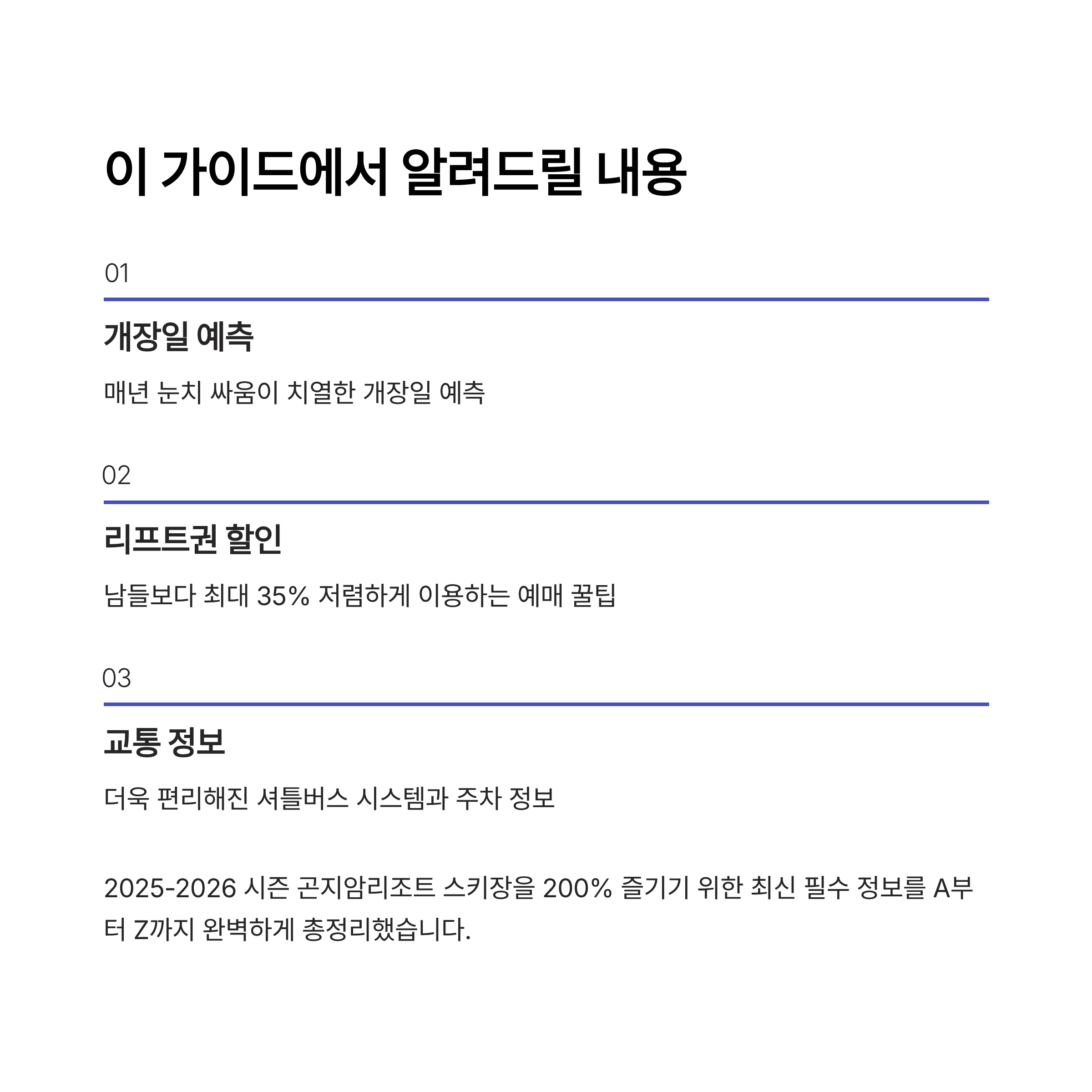 매년 눈치 싸움이 치열한 개장일 예측부터, 남들보다 최대 35% 저렴하게 이용하는 리프트권 예매 꿀팁, 그리고 더욱 편리해진 셔틀버스 시스템과 주차 정보까지! 2025-2026 시즌 곤지암리조트 스키장을 200% 즐기기 위한 최신 필수 정보를 A부터 Z까지 완벽하게 총정리했습니다.
