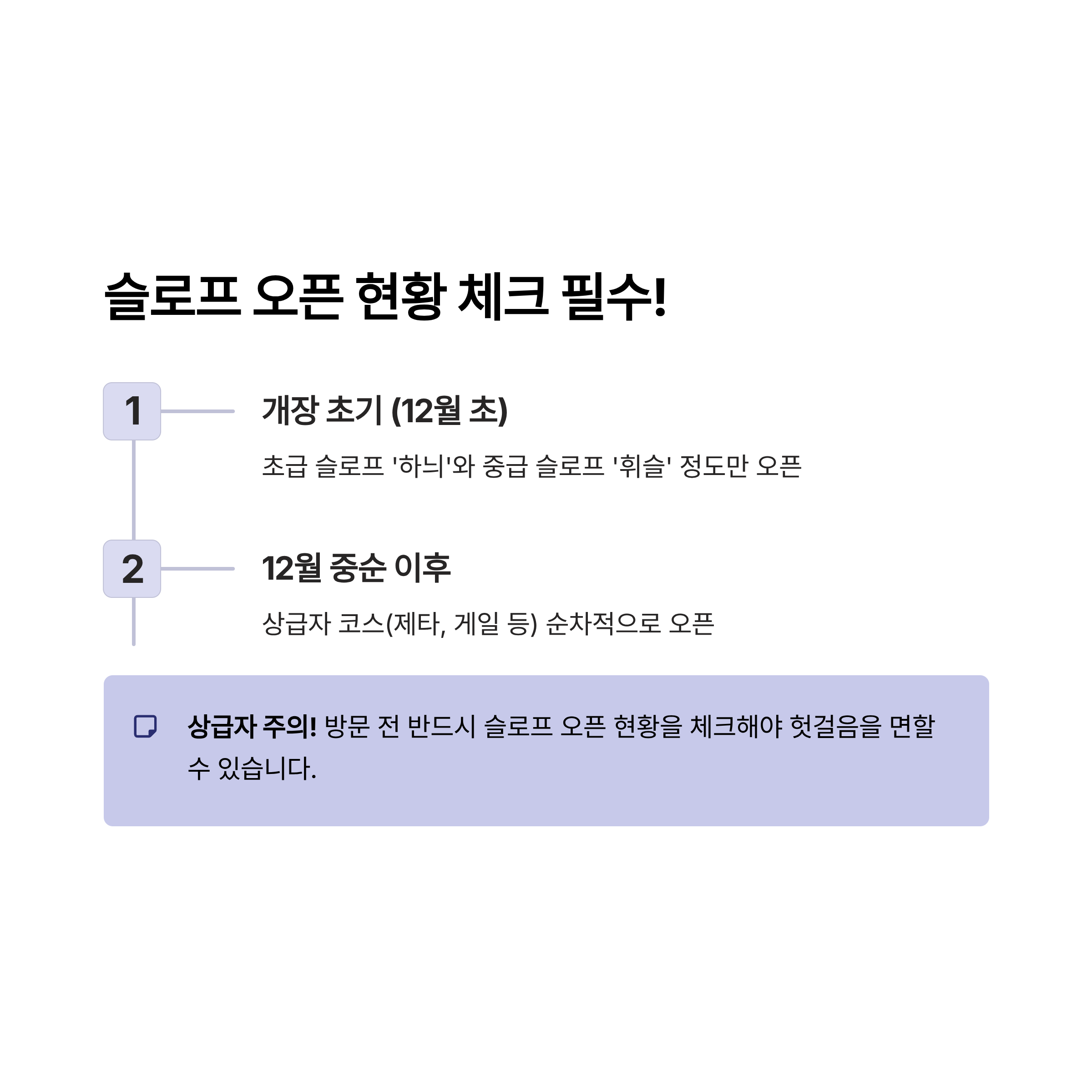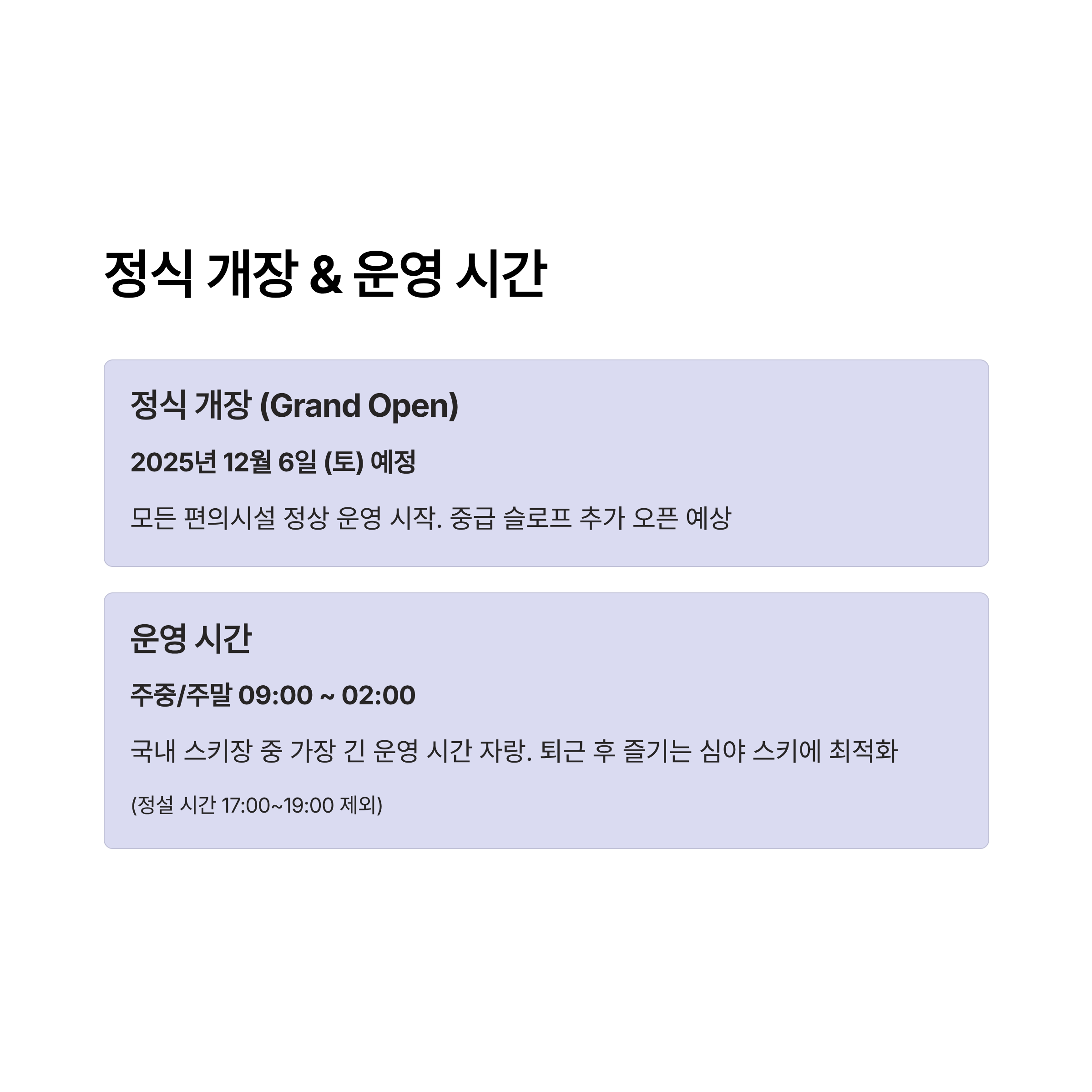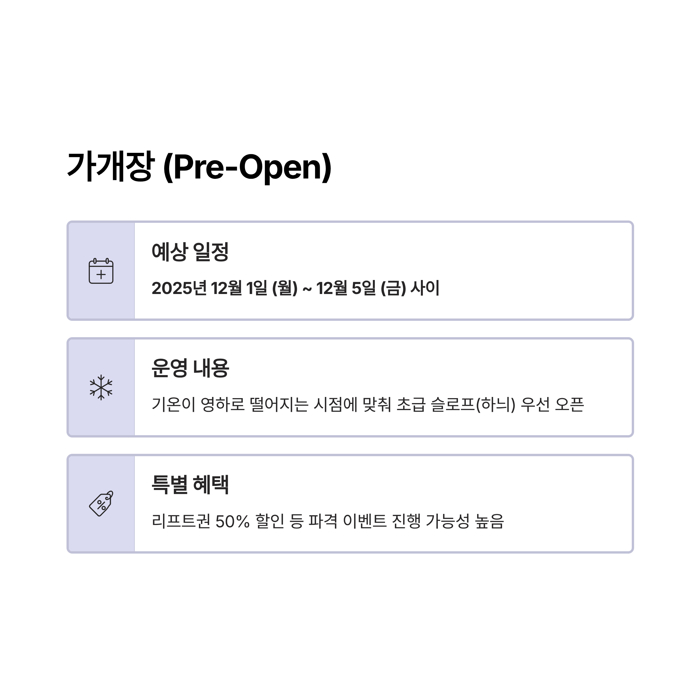 | 정식 개장 (Grand Open) | 2025년 12월 6일 (토) 예정 | 모든 편의시설 정상 운영 시작. 중급 슬로프 추가 오픈 예상. |