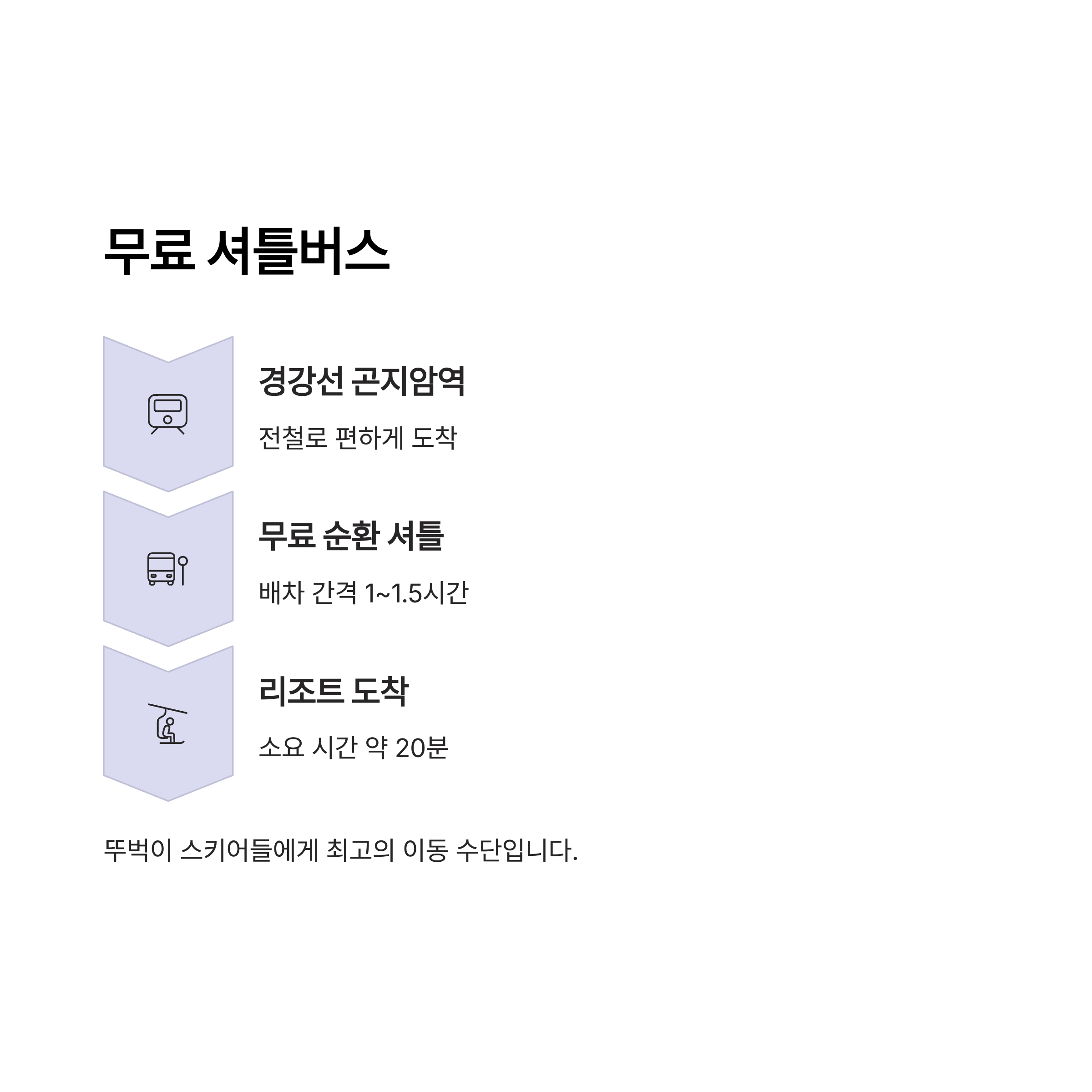 곤지암리조트의 최대 강점은 뛰어난 접근성입니다. 자차가 없어도 전철과 셔틀버스를 이용해 편하게 다녀올 수 있습니다.