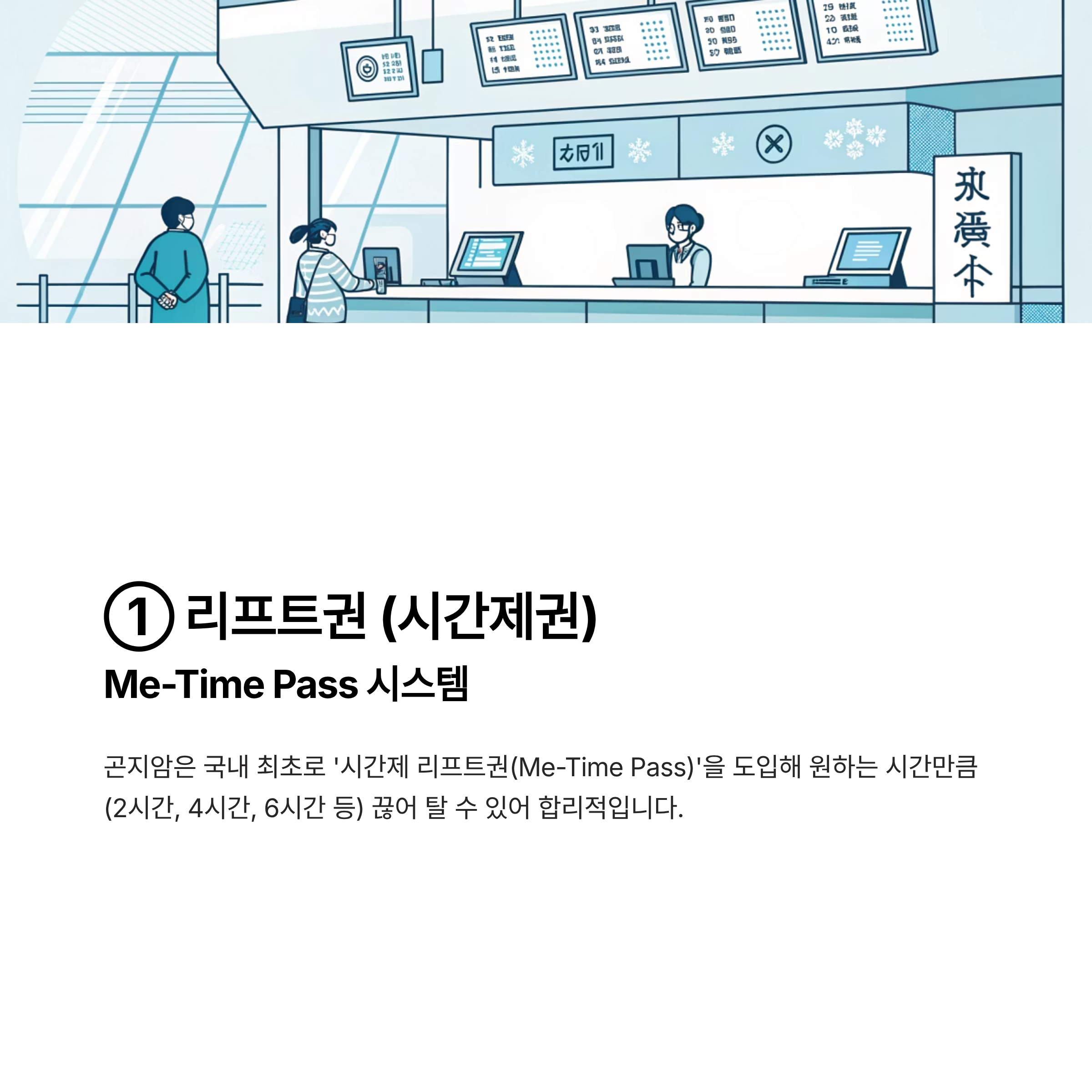 곤지암은 국내 최초로 '시간제 리프트권(Me-Time Pass)'을 도입해 원하는 시간만큼(2시간, 4시간, 6시간 등) 끊어 탈 수 있어 합리적입니다.