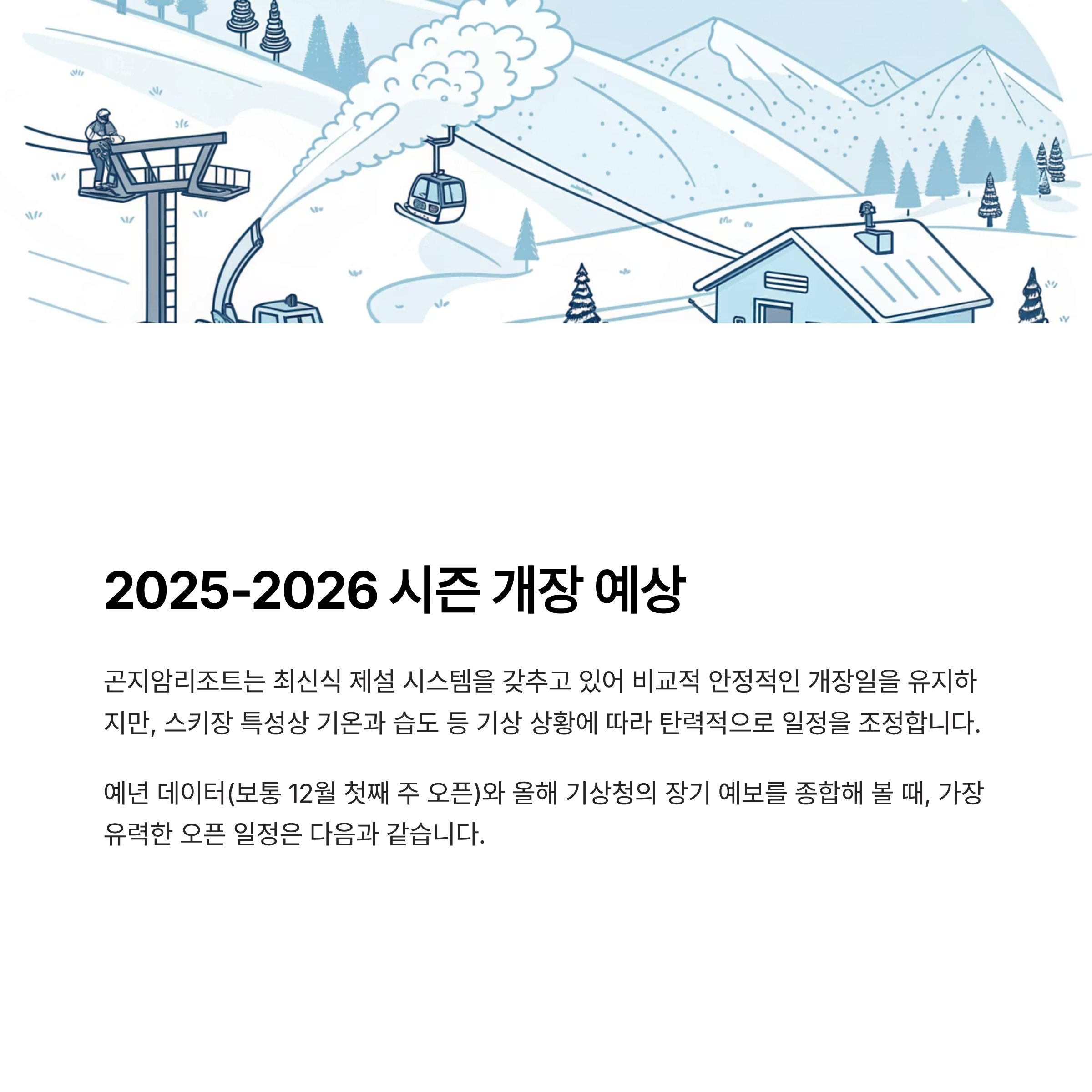 곤지암리조트는 최신식 제설 시스템을 갖추고 있어 비교적 안정적인 개장일을 유지하지만, 스키장 특성상 기온과 습도 등 기상 상황에 따라 탄력적으로 일정을 조정합니다. 예년 데이터(보통 12월 첫째 주 오픈)와 올해 기상청의 장기 예보를 종합해 볼 때, 가장 유력한 오픈 일정은 다음과 같습니다.