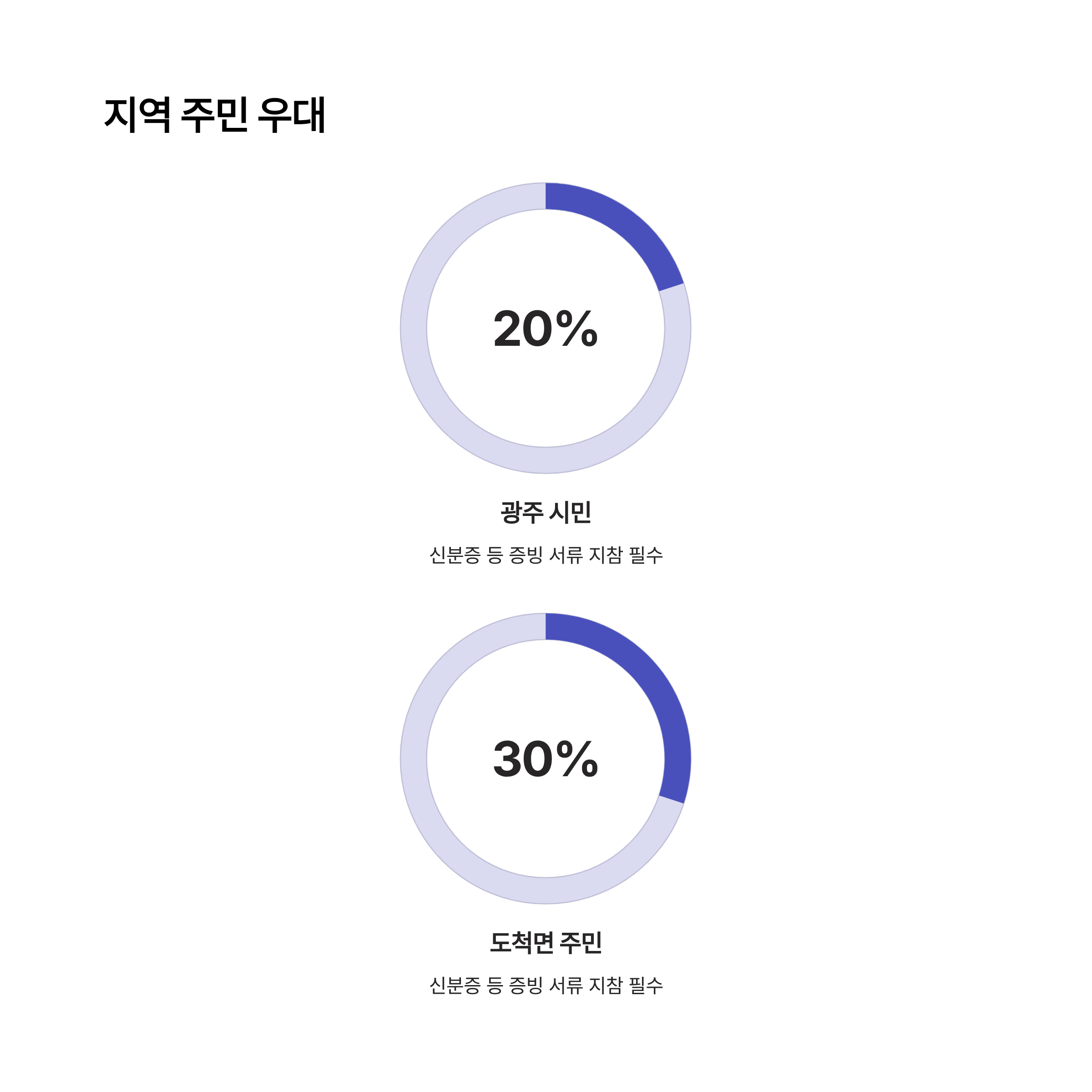- 지역 주민 우대: 광주 시민은 20%, 도척면 주민은 30% 할인을 받을 수 있습니다. (신분증 등 증빙 서류 지참 필수)