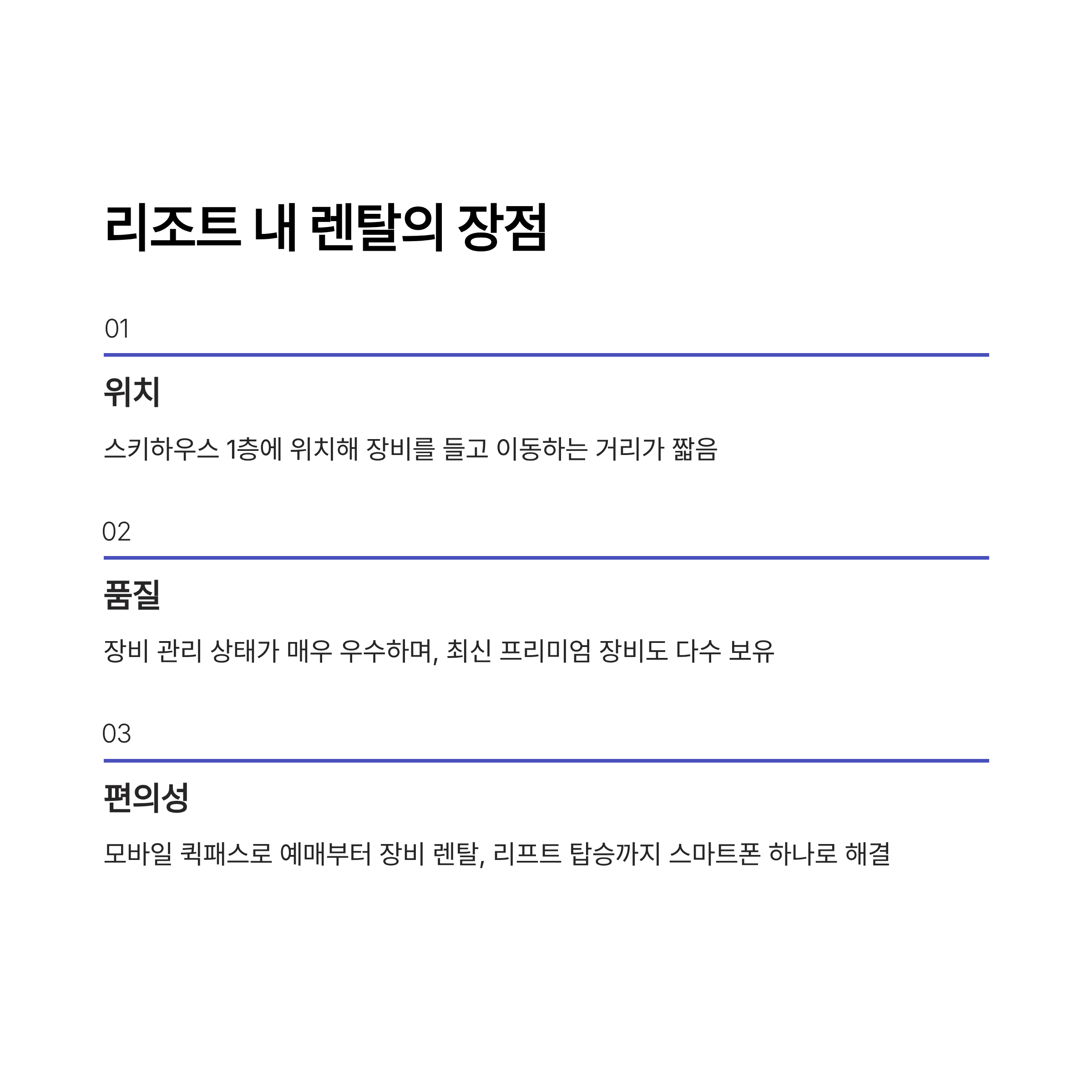 - 리조트 내 렌탈 (편리함): 스키하우스 1층에 위치해 있어 장비를 들고 이동하는 거리가 짧고, 반납도 바로 할 수 있어 편리함이 최우선인 분들에게 추천합니다. 장비 관리 상태가 매우 우수하며, 최신 프리미엄 장비도 다수 보유하고 있습니다. 특히 '모바일 퀵패스'를 이용하면 예매부터 장비 렌탈, 리프트 탑승까지 스마트폰 하나로 해결되어 대기 시간을 획기적으로 줄일 수 있습니다.