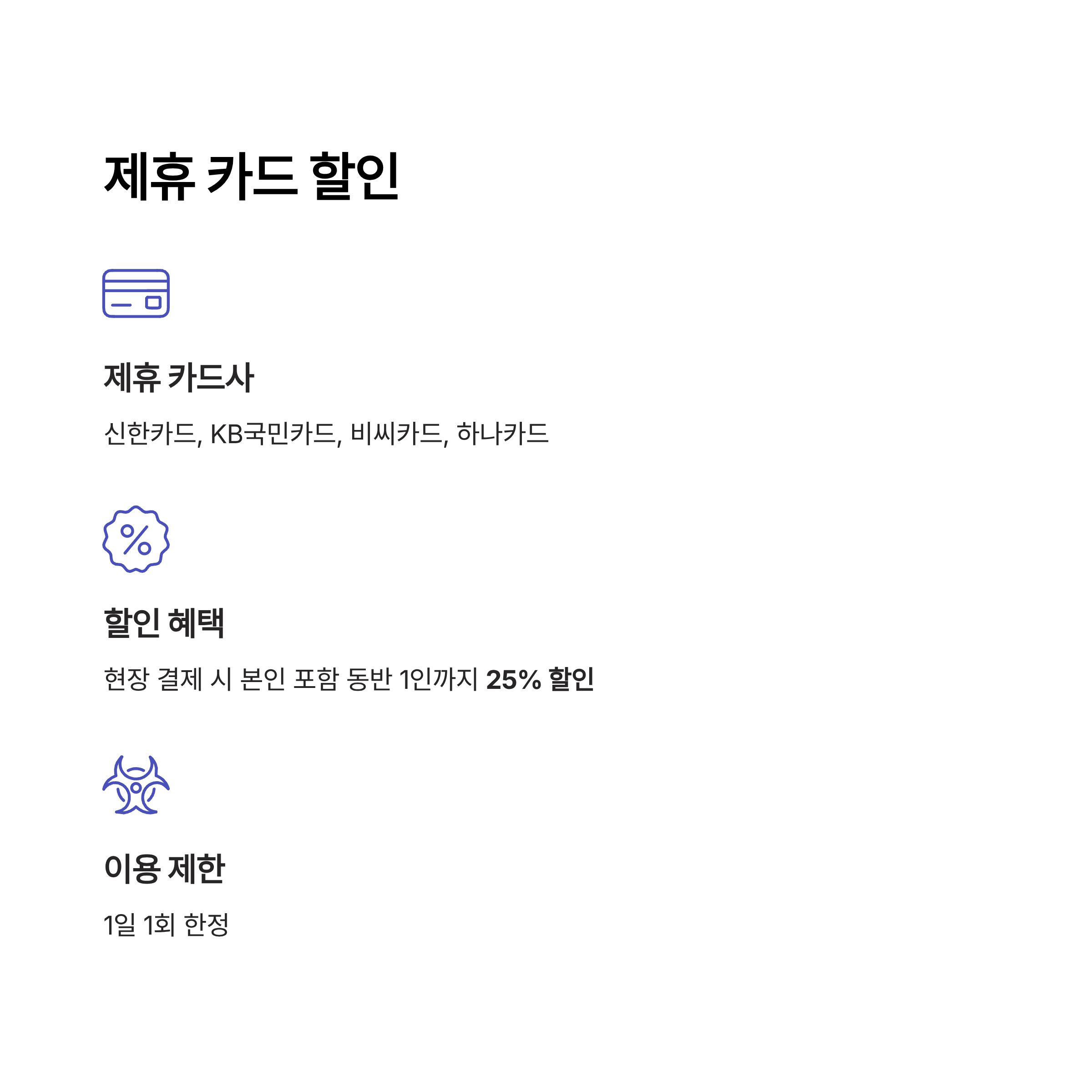 - 제휴 카드 할인: 신한카드, KB국민카드, 비씨카드, 하나카드 등으로 현장 결제 시 본인 포함 동반 1인까지 25% 할인 혜택이 제공됩니다. (1일 1회 한정)