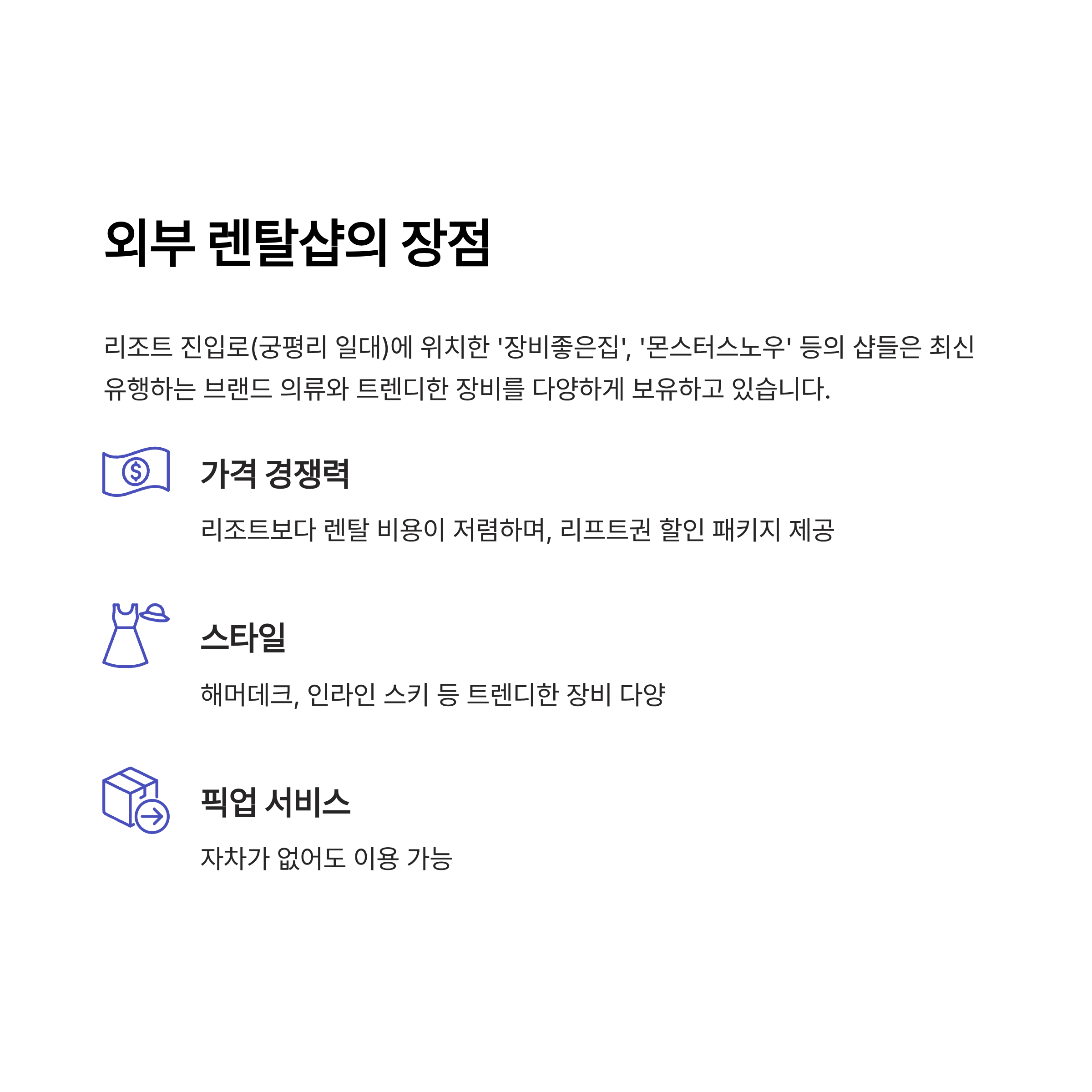 - 외부 렌탈샵 (가성비 & 스타일): 리조트 진입로(궁평리 일대)에 위치한 '장비좋은집', '몬스터스노우' 등의 샵들은 최신 유행하는 브랜드 의류와 트렌디한 장비(해머데크, 인라인 스키 등)를 다양하게 보유하고 있습니다. 리조트보다 렌탈 비용이 저렴하며, 리프트권 할인 패키지를 묶어서 판매하기 때문에 가격 경쟁력이 높습니다. 대부분의 샵에서 장비 픽업 서비스를 제공하므로 자차가 없어도 이용 가능합니다.