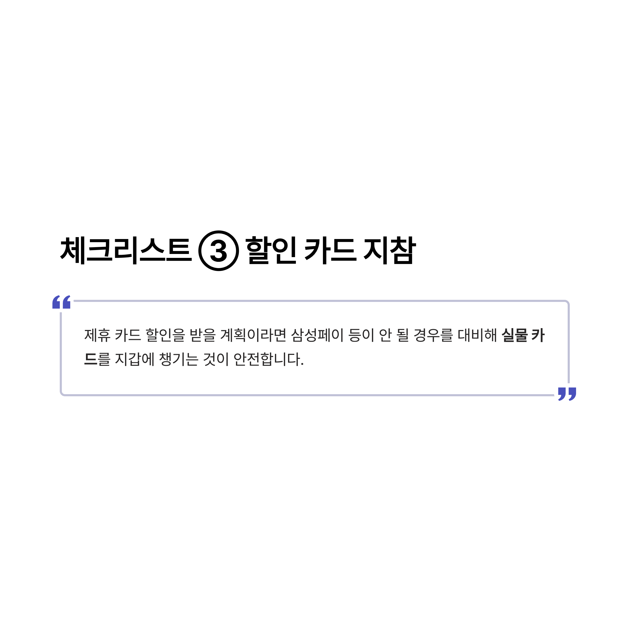 - 할인 카드 지참: 제휴 카드 할인을 받을 계획이라면 삼성페이 등이 안 될 경우를 대비해 실물 카드를 지갑에 챙기는 것이 안전합니다.