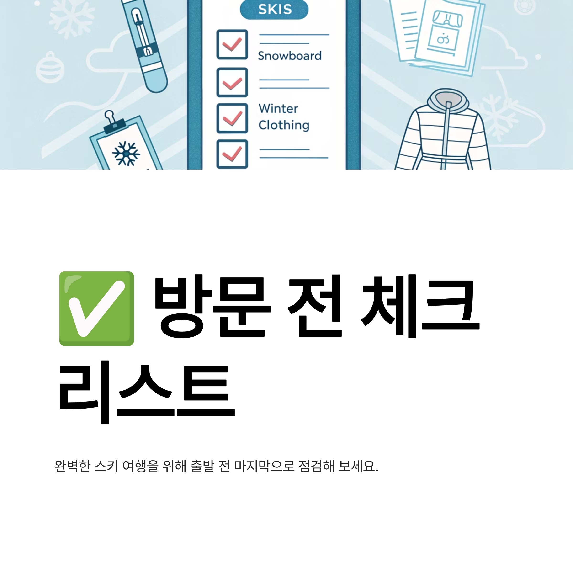 - 안전 장비 준비: 최근 안전 문제로 헬멧 착용이 의무화되는 추세입니다. 렌탈도 가능하지만 위생상 개인 헬멧이나 따뜻한 비니를 준비하는 것이 좋습니다. 고글(야간 스키 시 필수), 방수 장갑, 엉덩이 보호대, 무릎 보호대 등 보호 장비도 잊지 말고 챙기세요. 핫팩도 넉넉히 준비하면 좋습니다.