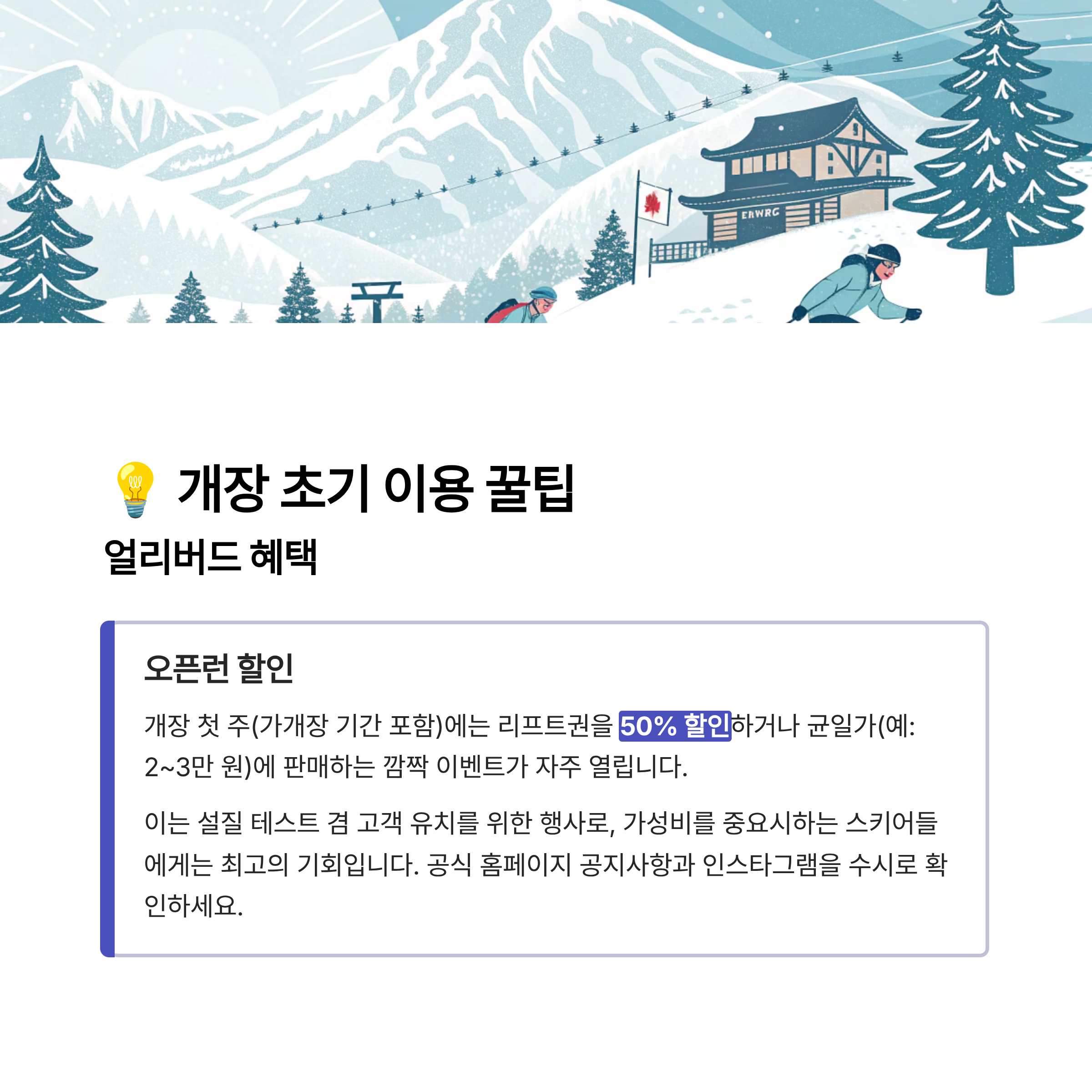 | 가개장 (Pre-Open) | 2025년 12월 1일 (월) ~ 12월 5일 (금) 사이 | 기온이 영하로 떨어지는 시점에 맞춰 초급 슬로프(하늬) 우선 오픈. 리프트권 50% 할인 등 파격 이벤트 진행 가능성 높음. |