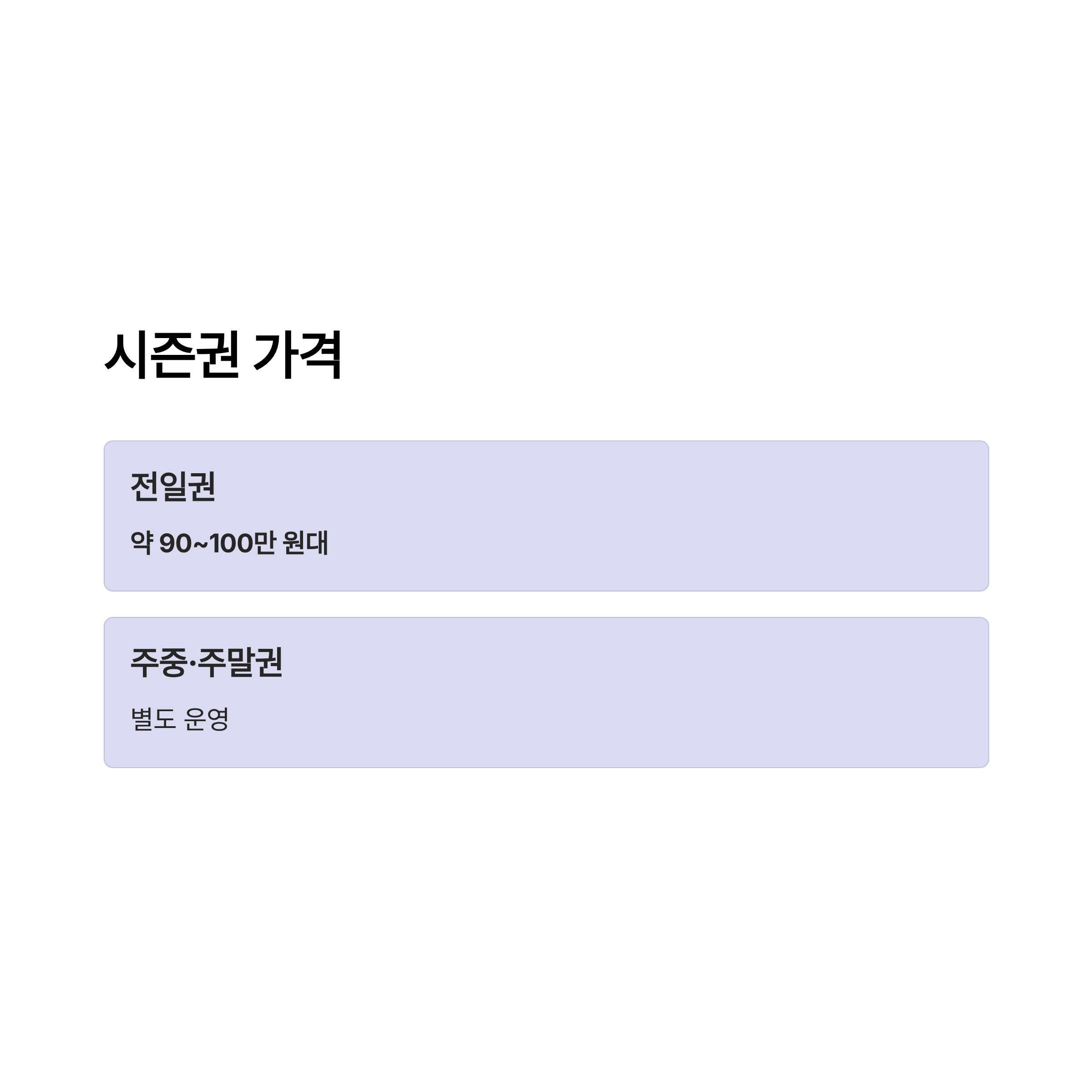 - 가격: 전일권 약 90~100만 원대 / 주중·주말권 별도 운영
