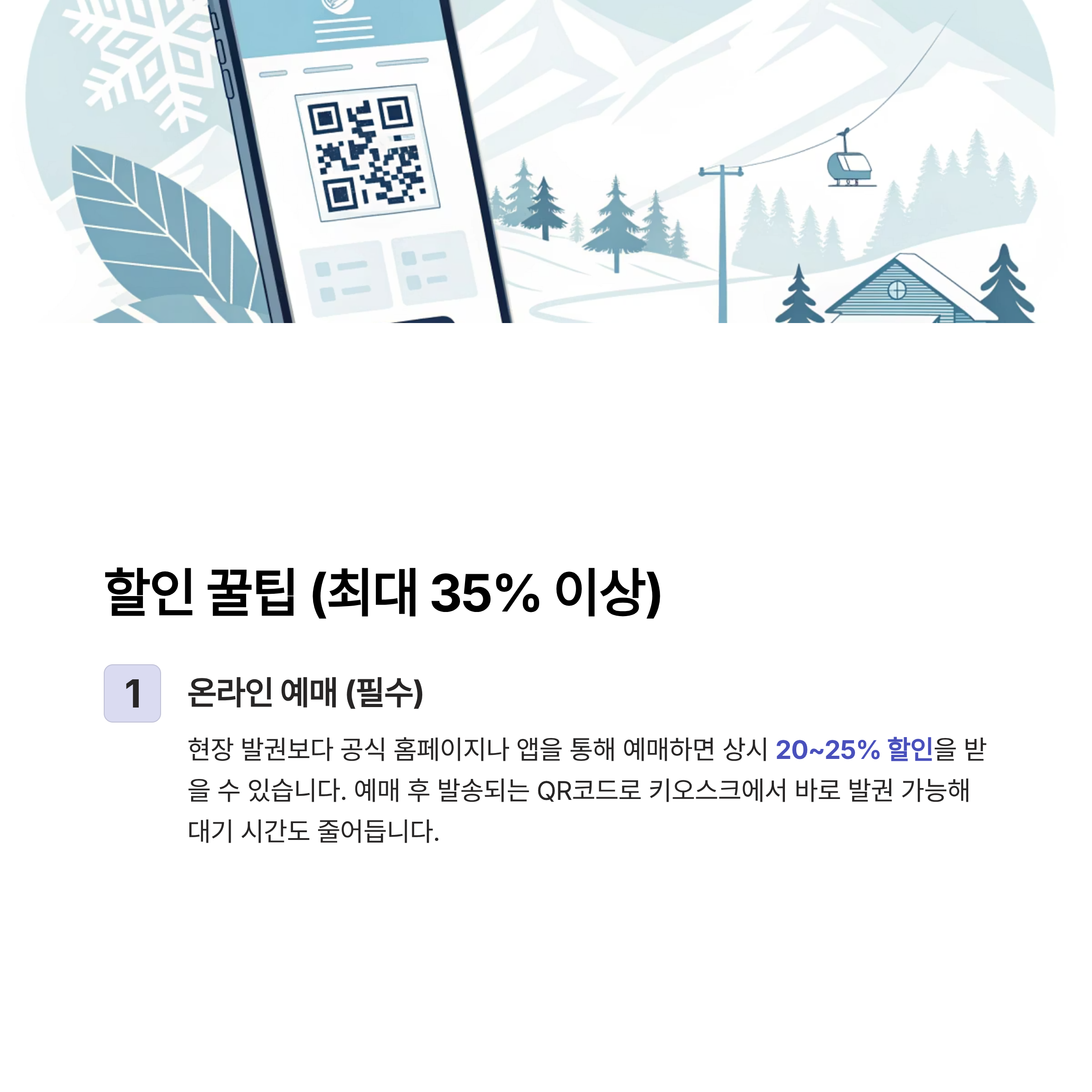 - 리프트권 예매: 방문 전날까지 온라인이나 앱으로 예매하여 최소 20~25% 할인을 챙기세요. 당일 현장 구매는 할인이 적용되지 않거나 할인율이 낮습니다.