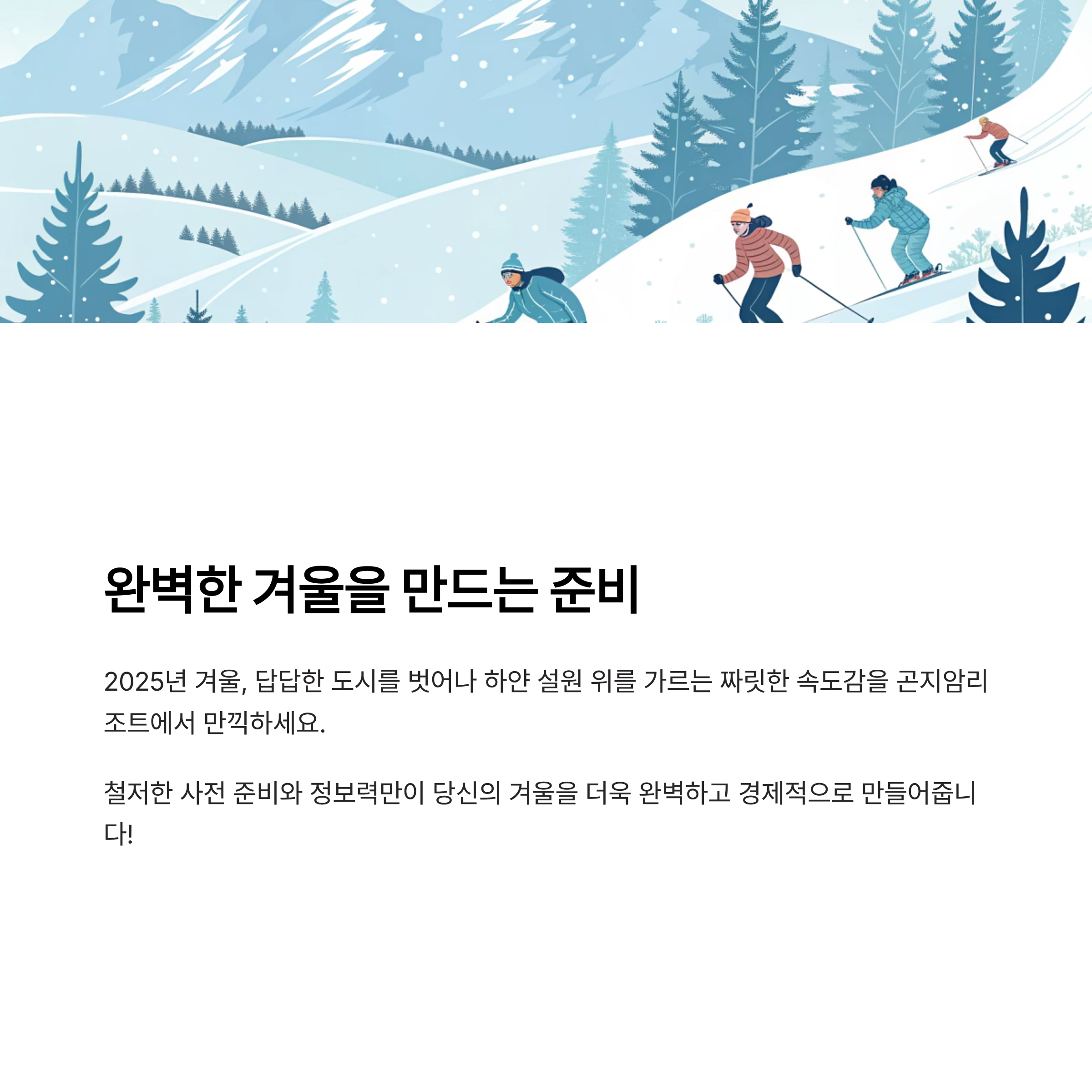 2025년 겨울, 답답한 도시를 벗어나 하얀 설원 위를 가르는 짜릿한 속도감을 곤지암리조트에서 만끽하세요. 철저한 사전 준비와 정보력만이 당신의 겨울을 더욱 완벽하고 경제적으로 만들어줍니다!