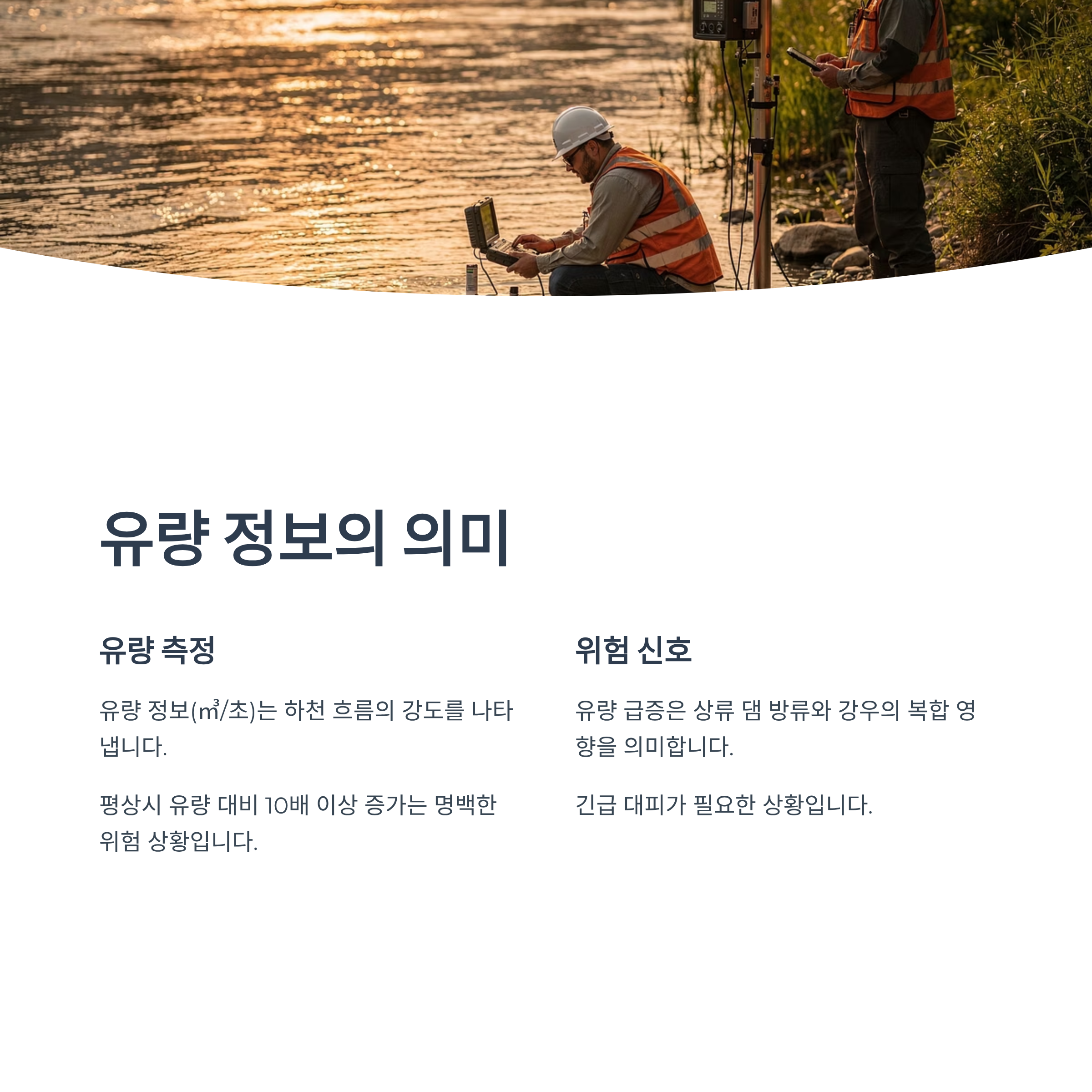 유량 정보(세제곱미터/초)는 하천 흐름의 강도를 나타냅니다.