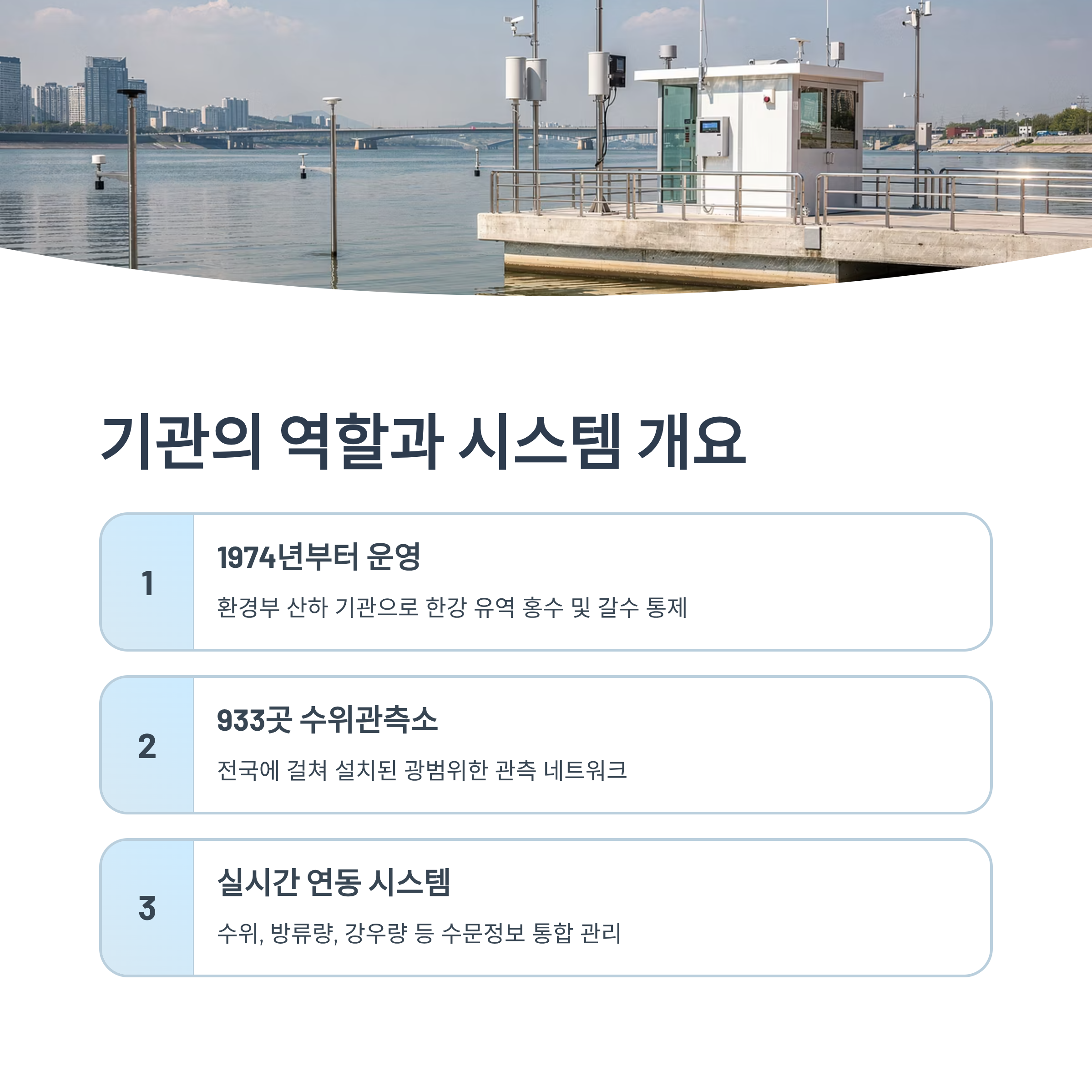 전국에 걸쳐 933곳의 수위관측소가 설치되어 있으며, 한강 유역에만 수십 개의 CCTV 카메라가 주요 지점에 배치되어 실시간 영상을 제공합니다.