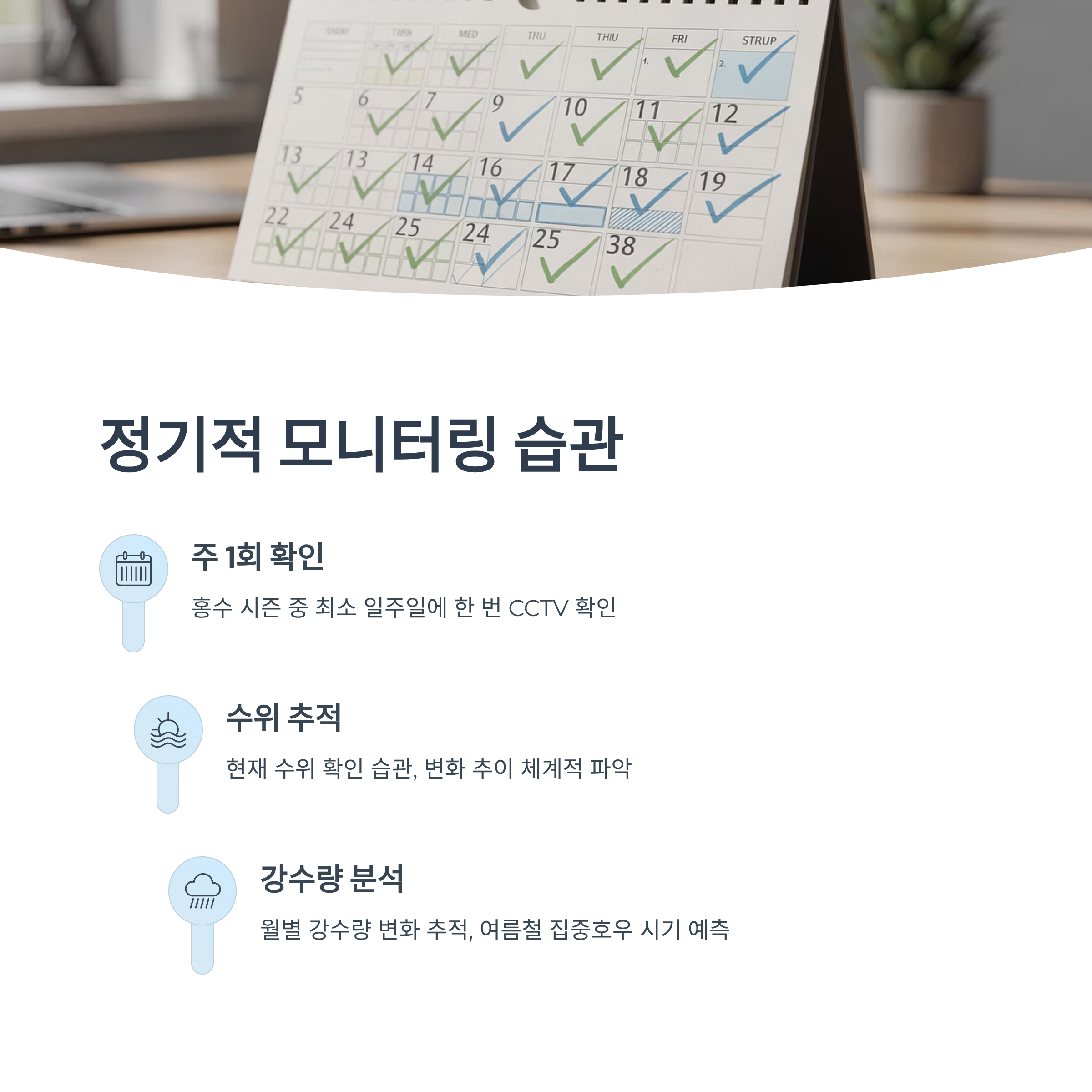 홍수 시즌 중에는 최소 일주일에 한 번은 한강홍수통제소 CCTV를 확인합니다. 현재 수위를 확인하는 습관을 들입니다. 변화 추이를 체계적으로 파악합니다. 월별 강수량 변화를 추적합니다. 여름철 집중호우 시기를 미리 예측합니다.