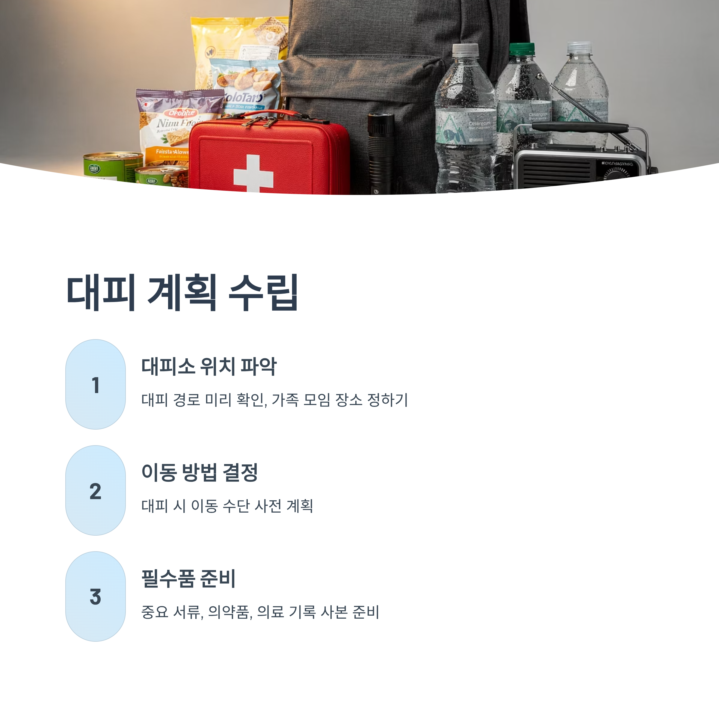 대피소의 위치를 파악합니다. 대피 경로를 미리 확인합니다. 가족 구성원들과 모임 장소를 정합니다. 이동 방법을 미리 정합니다. 대피 시 필요한 중요 서류 목록을 준비합니다. 의약품 목록을 정리합니다. 의료 기록을 사본으로 준비합니다.