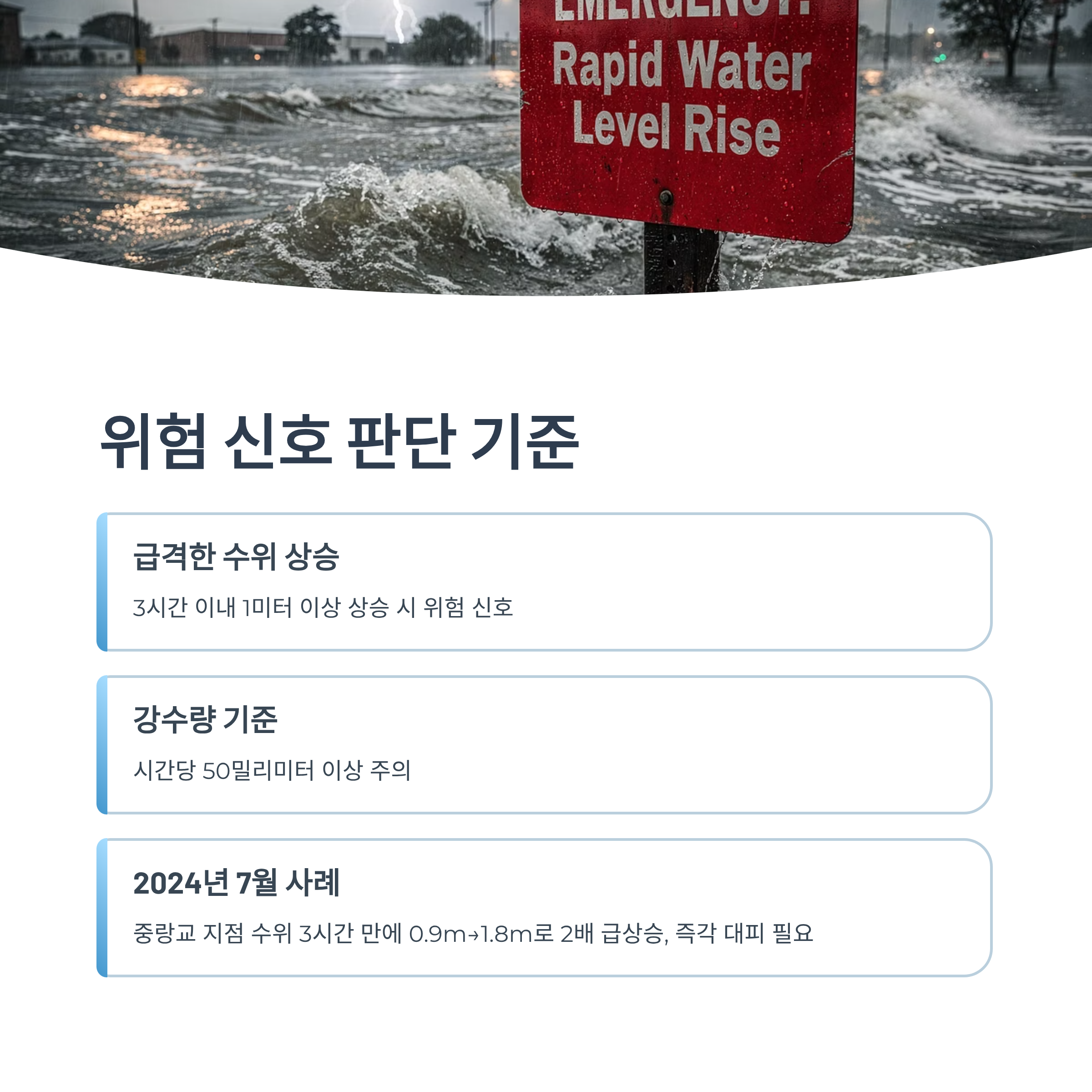 수위가 3시간 이내에 1미터 이상 상승하는 경우는 위험 신호입니다. 강수량이 시간당 50밀리미터 이상인 경우도 주의해야 합니다.