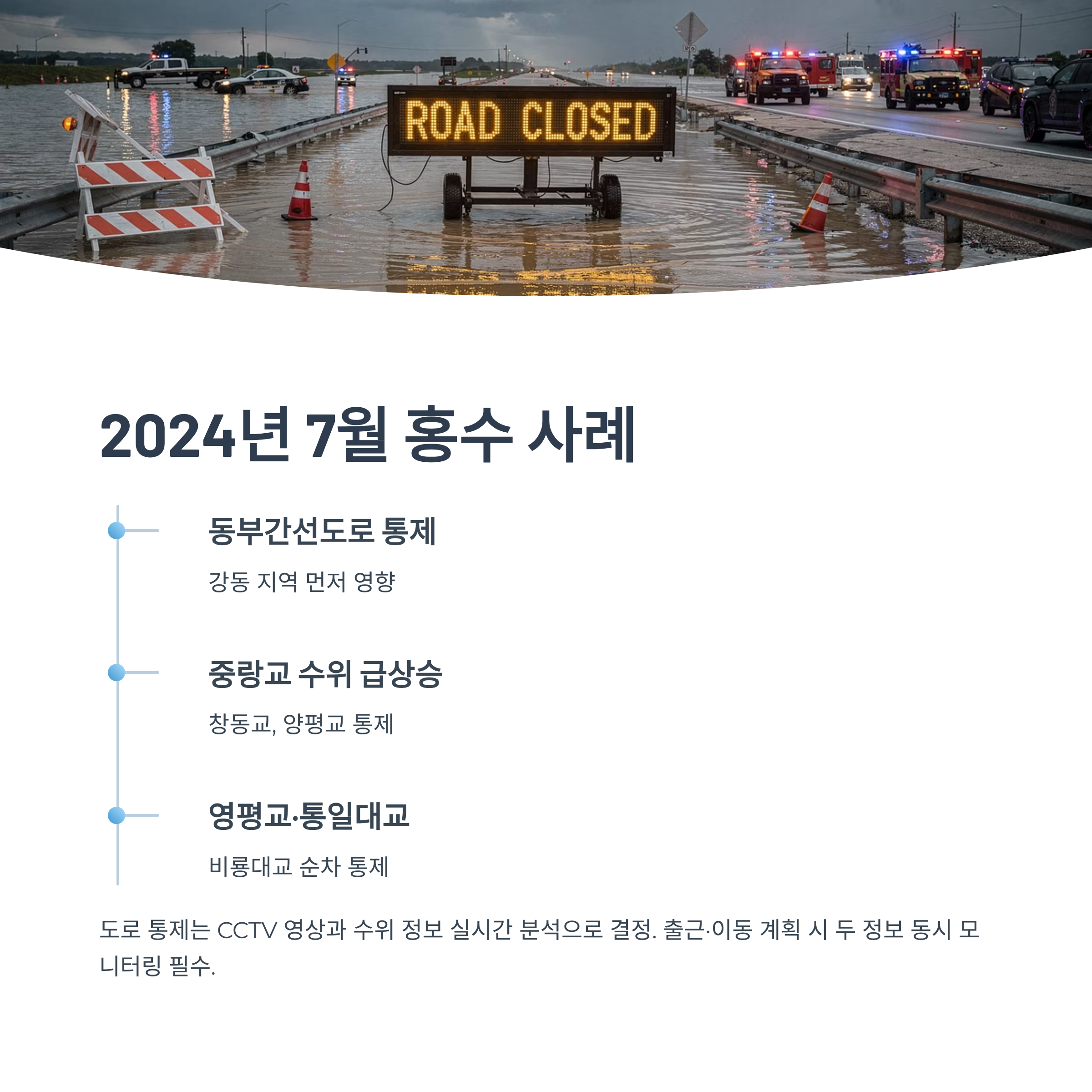 동부간선도로가 순차적으로 통제되었습니다. 강동 지역이 먼저 영향을 받았습니다. 창동교 주변이 통제 대상이 되었습니다. 중랑교 수위가 급상승했습니다. 양평교도 통제되었습니다. 영평교 지역도 영향을 받았습니다. 통일대교가 통제되었습니다. 비룡대교도 순차적으로 통제되었습니다. 도로 통제는 CCTV 영상과 수위 정보를 실시간으로 분석하여 결정됩니다. 출근이나 이동 계획이 있는 주민들은 두 가지 정보를 동시에 모니터링해야 합니다.