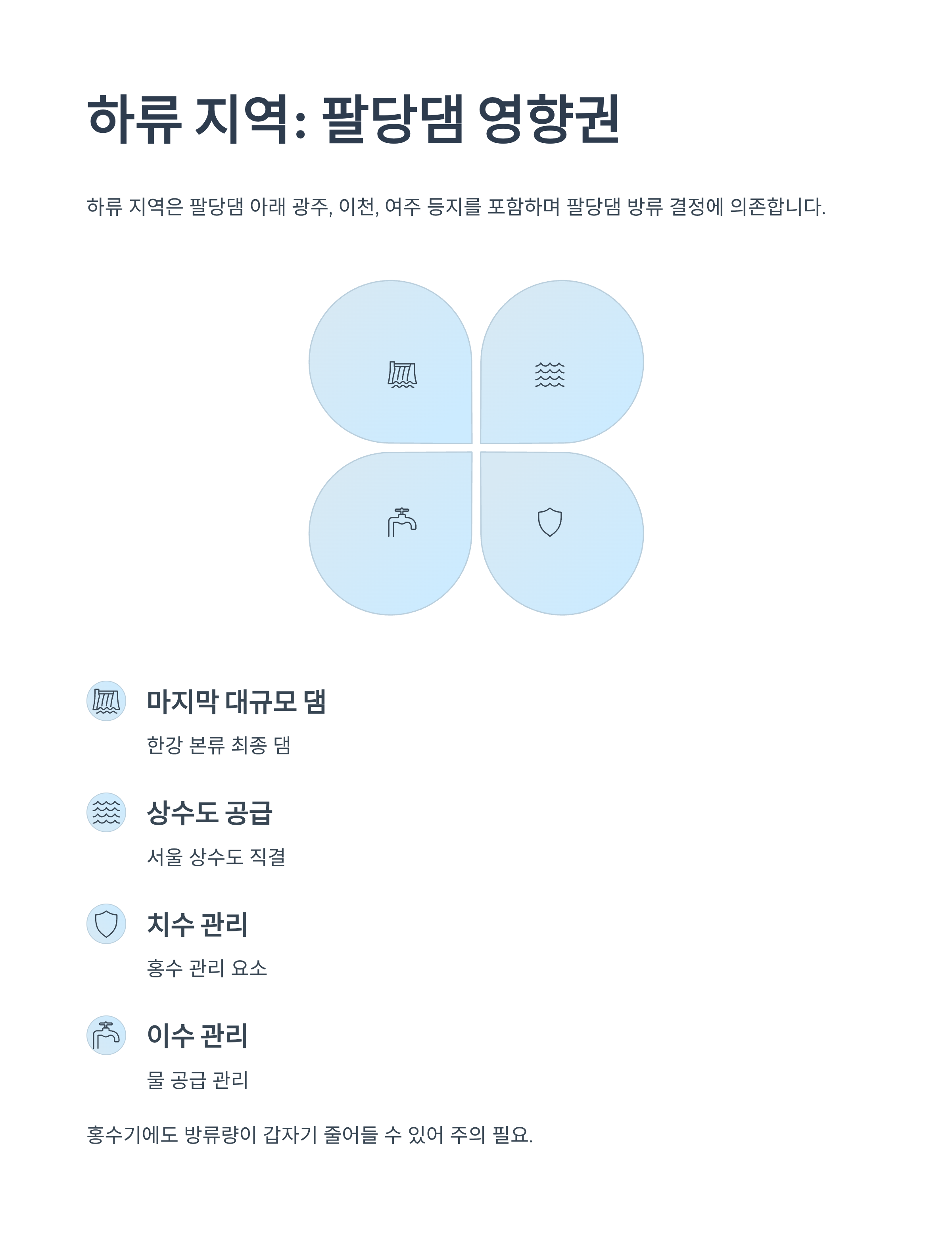 서울의 상수도 공급과도 직결되어 있습니다. 방류량 결정에는 치수(홍수 관리) 요소가 반영됩니다.