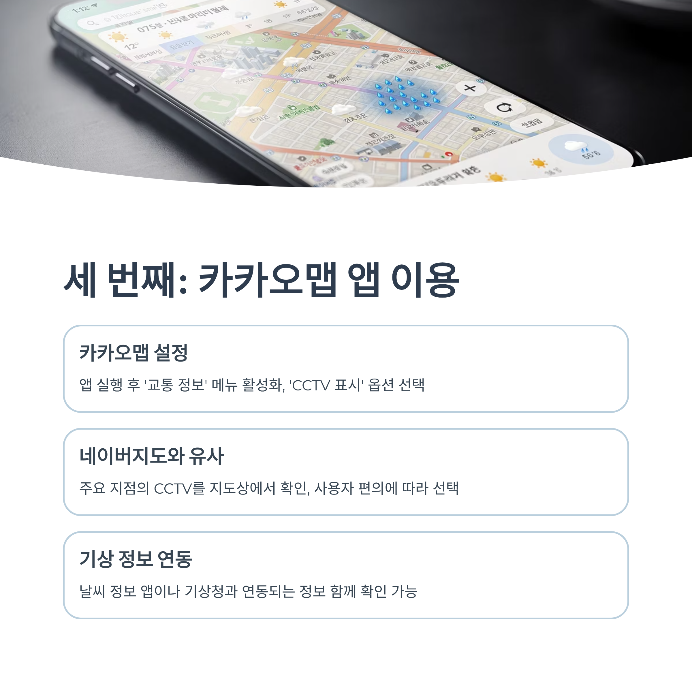 카카오맵 앱을 실행합니다. '교통 정보' 메뉴를 활성화합니다. 'CCTV 표시' 옵션을 선택합니다. 네이버지도와 유사하게 주요 지점의 CCTV를 지도상에서 확인할 수 있습니다.