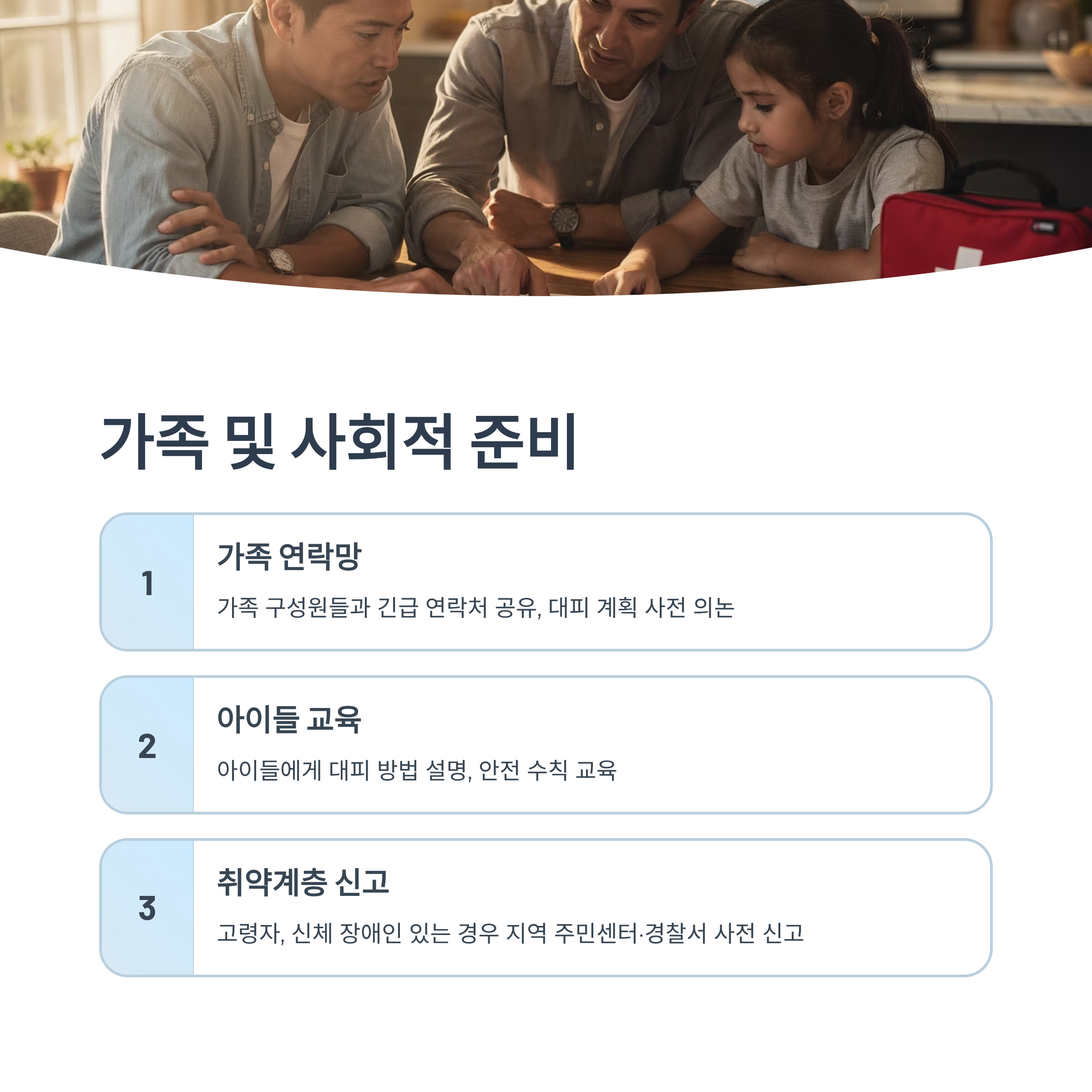 가족 구성원들과 긴급 연락처를 공유합니다. 대피 계획을 사전에 의논합니다. 아이들에게 대피 방법을 설명합니다. 고령자나 신체 장애인이 있는 경우 지역 주민센터에 사전 신고합니다. 경찰서에도 미리 알립니다. 긴급 상황 발생 시 신속한 대피 지원을 받을 수 있도록 준비합니다.