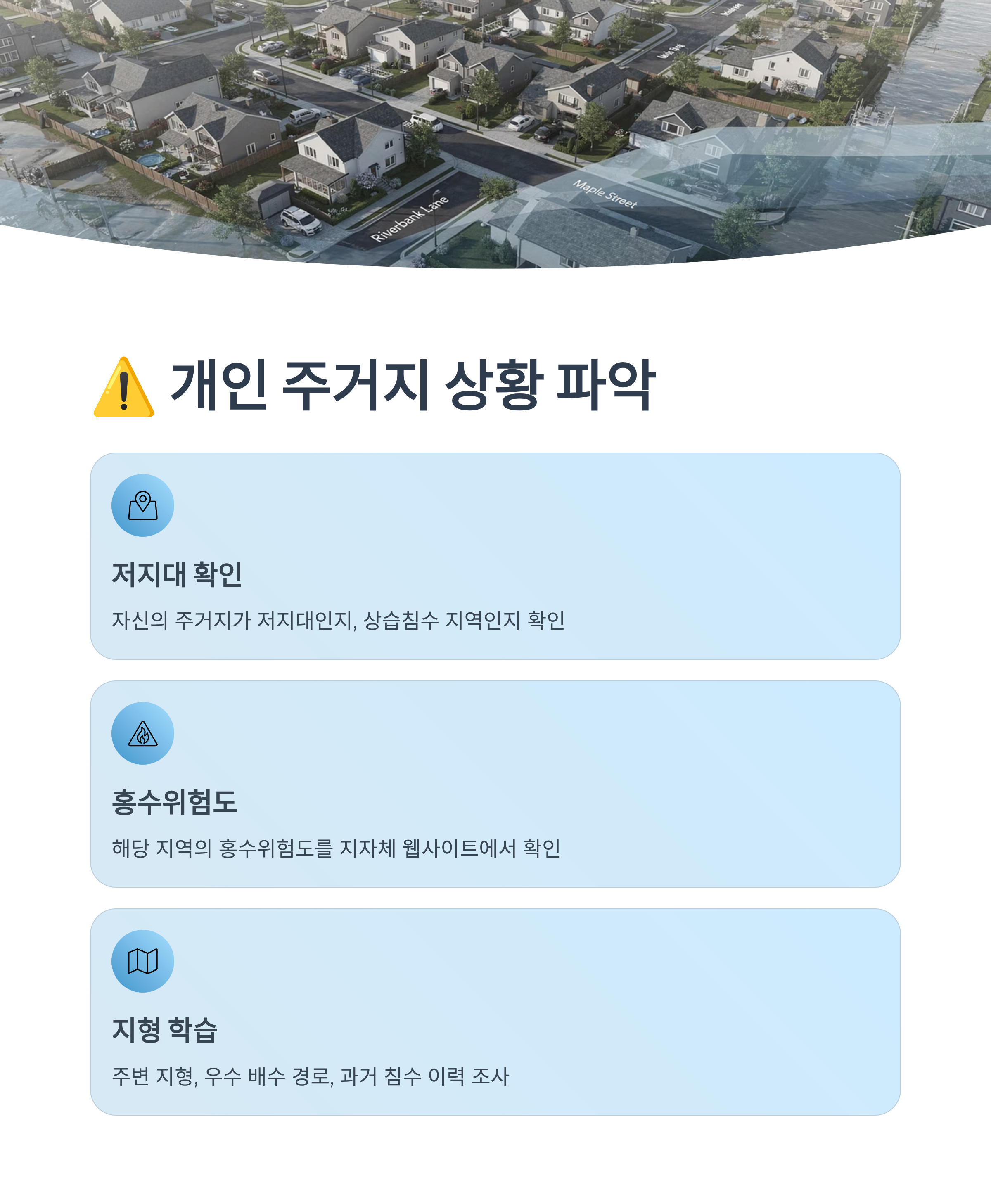 자신의 주거지가 저지대인지 확인합니다. 상습침수 지역인지 파악합니다. 해당 지역의 홍수위험도를 지자체 웹사이트에서 확인합니다. 주변 지형을 미리 학습합니다. 우수 배수 경로를 파악합니다. 과거 침수 이력을 조사합니다.