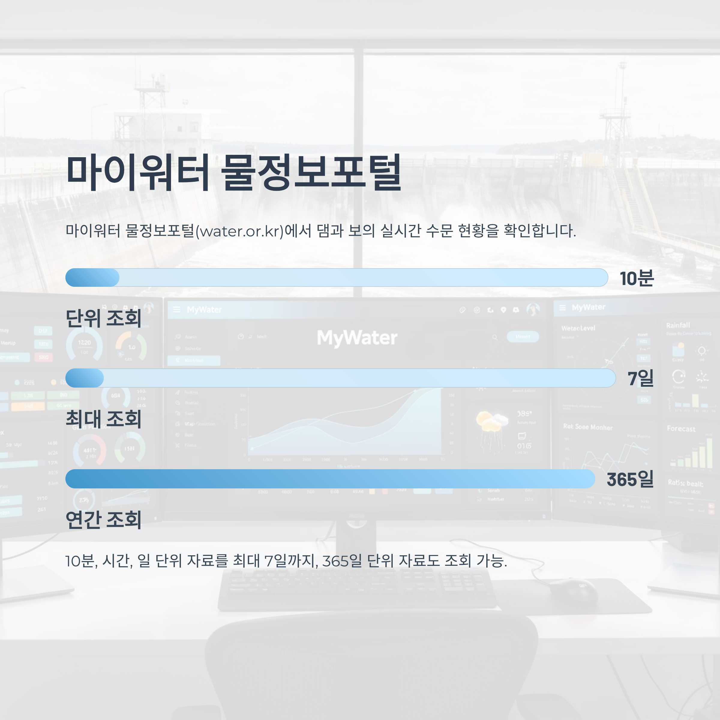 마이워터 물정보포털(water.or.kr)에서 댐과 보의 실시간 수문 현황을 확인합니다. 10분 단위 자료를 조회할 수 있습니다. 시간 단위 자료도 제공됩니다. 일 단위 자료를 확인 가능합니다. 최대 7일까지 조회 가능합니다. 365일 단위 자료도 조회 가능합니다.