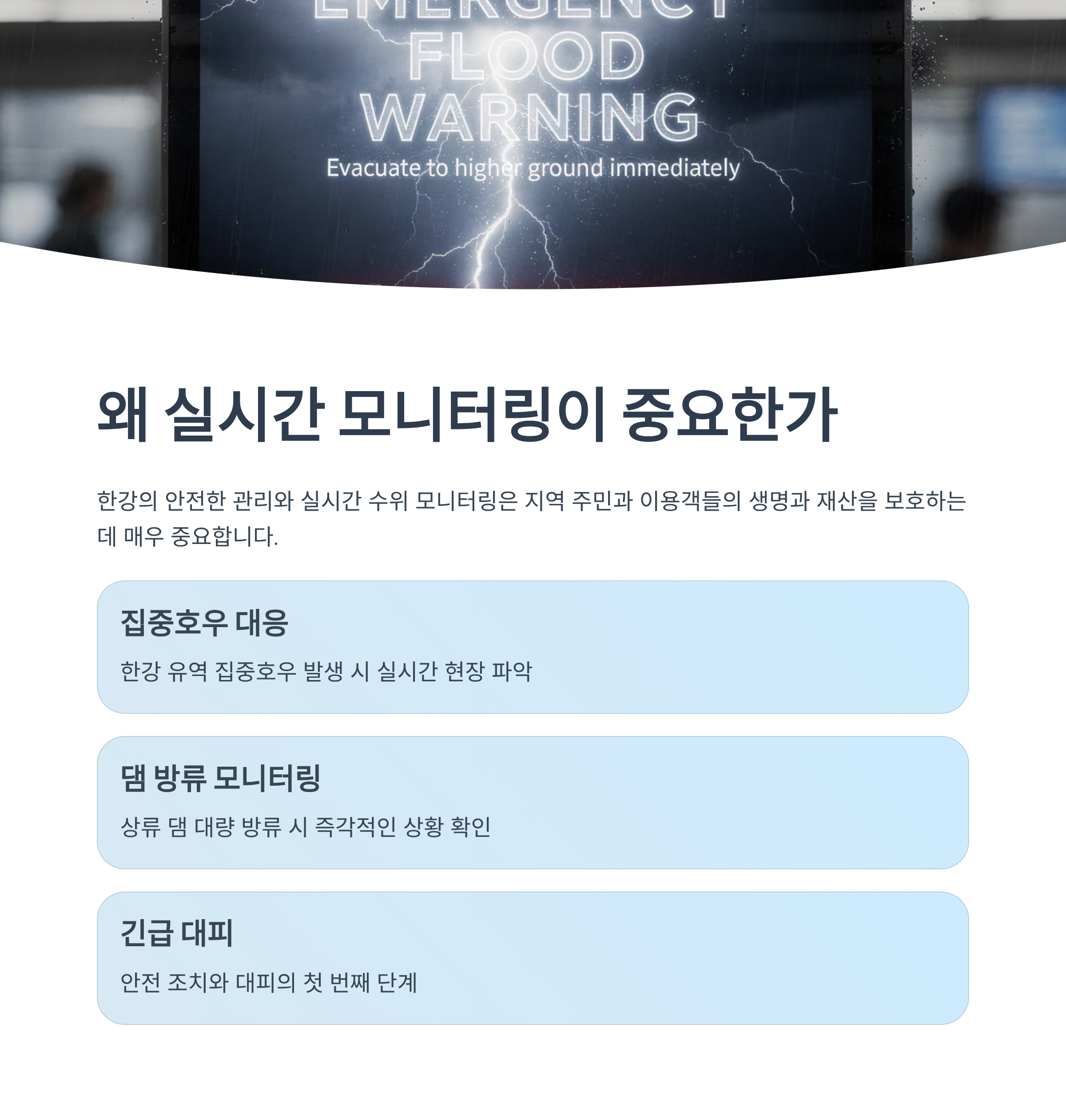 특히 한강 유역에 집중호우가 발생하거나 상류 댐에서 대량의 방류가 진행될 때, 실시간으로 현장 상황을 파악하는 것이 긴급 대피와 안전 조치의 첫 번째 단계입니다.