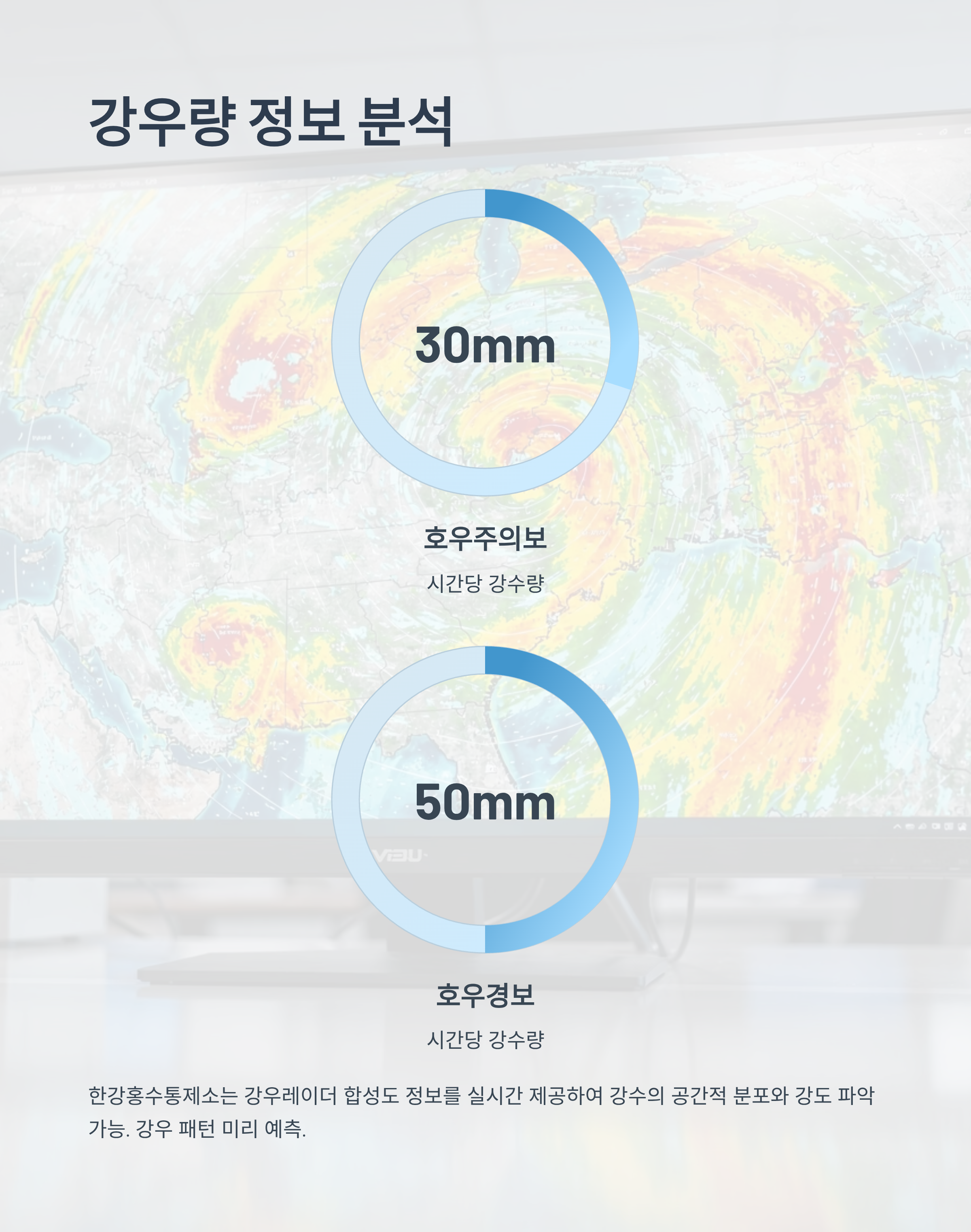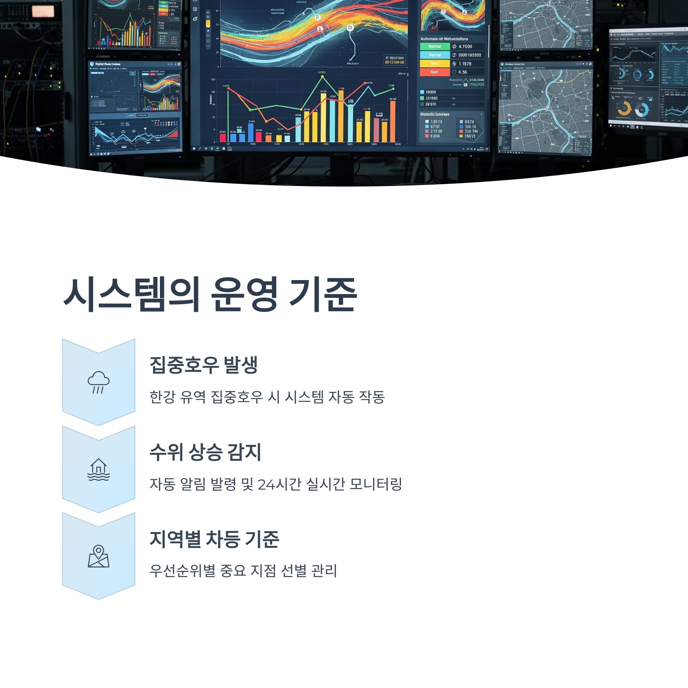 한강 유역에 집중호우가 발생할 경우 시스템이 자동 작동합니다. 수위 상승 시 자동으로 알림이 발령됩니다.
