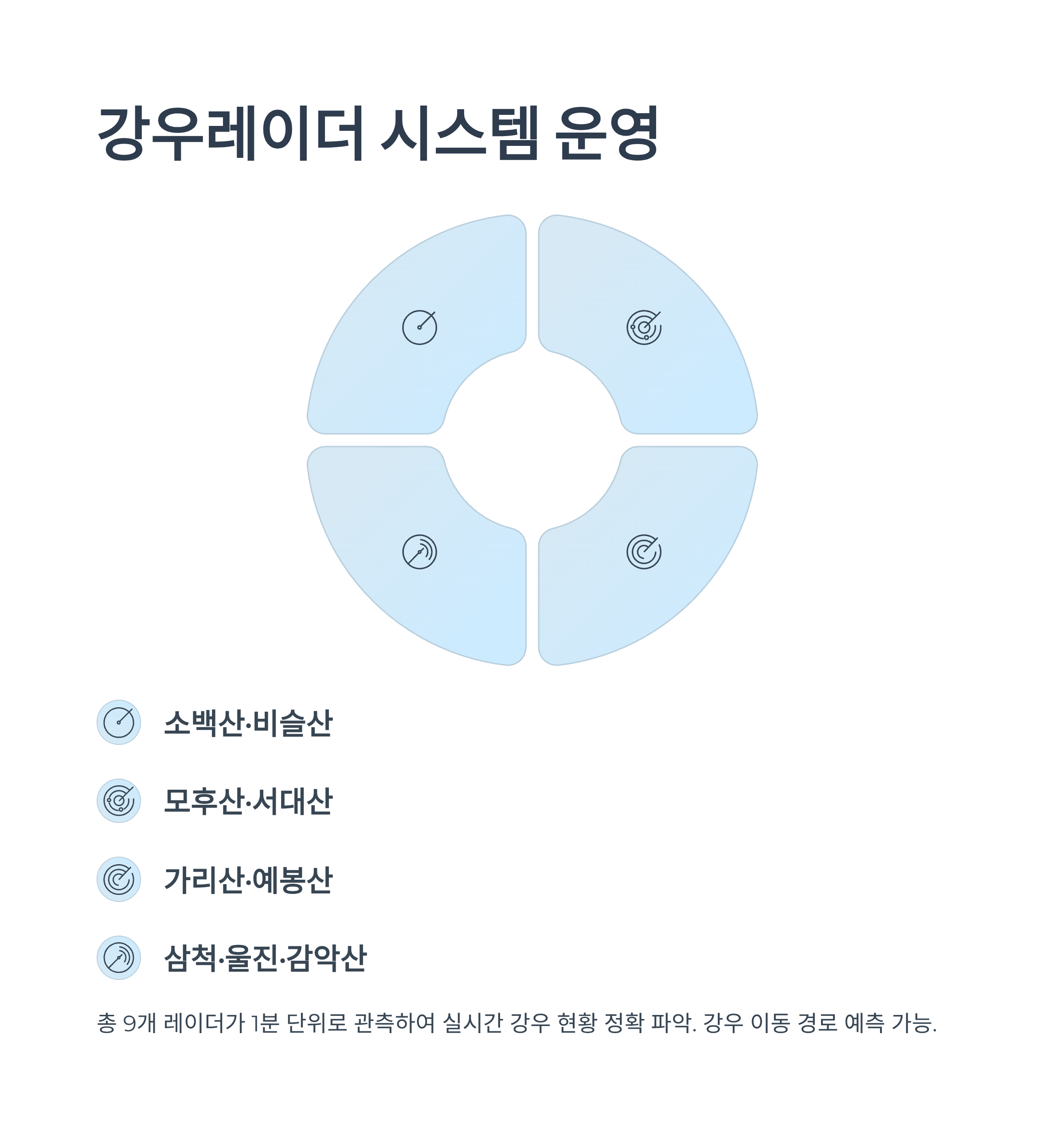 예봉산, 삼척, 울진, 감악산의 레이더도 운영됩니다. 총 9개 레이더가 1분 단위로 관측합니다.