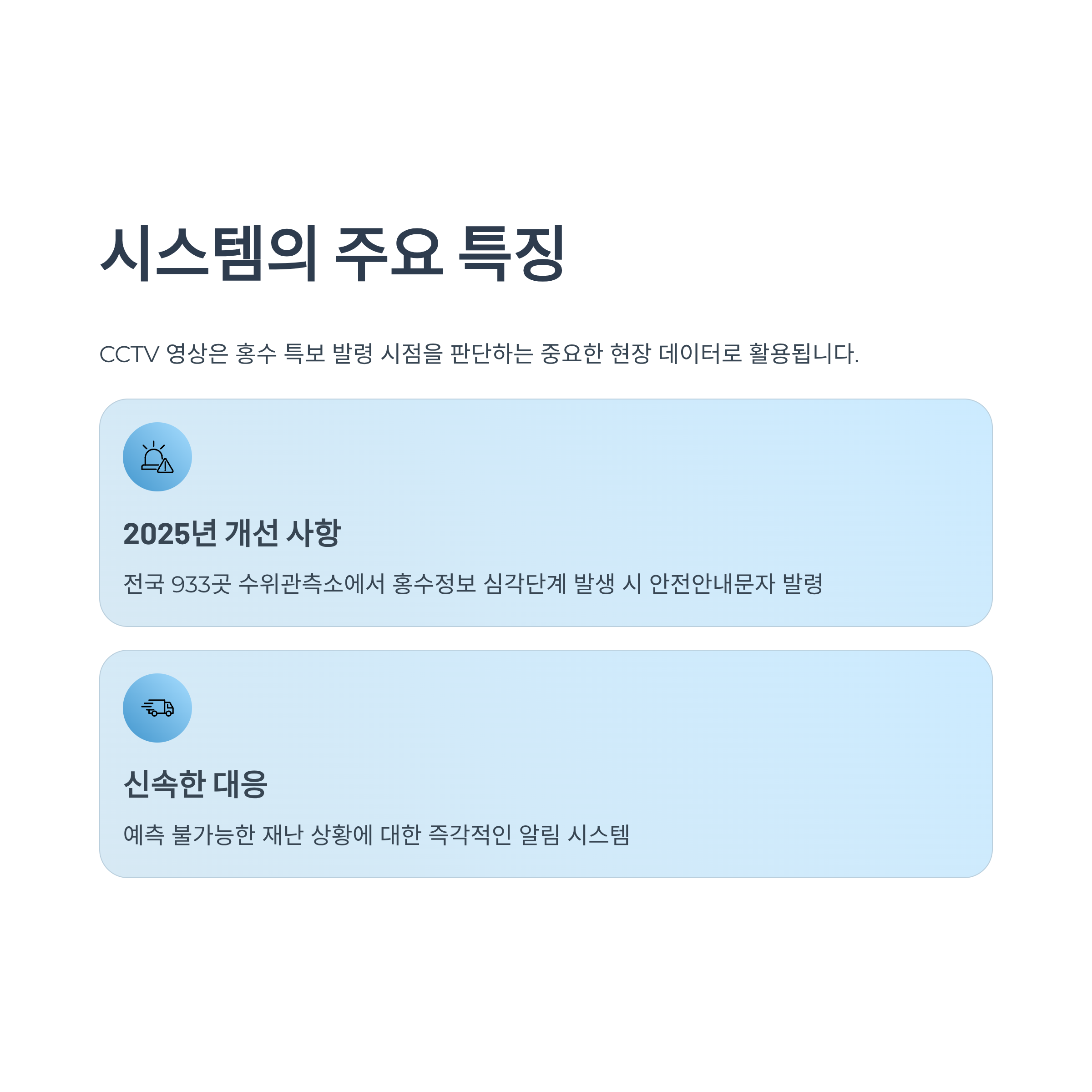 2025년부터는 종전 223곳의 홍수특보 지점뿐 아니라 전국 933곳의 수위관측소에서 홍수정보 심각단계 발생 시 안전안내문자가 발령되도록 개선되었습니다.