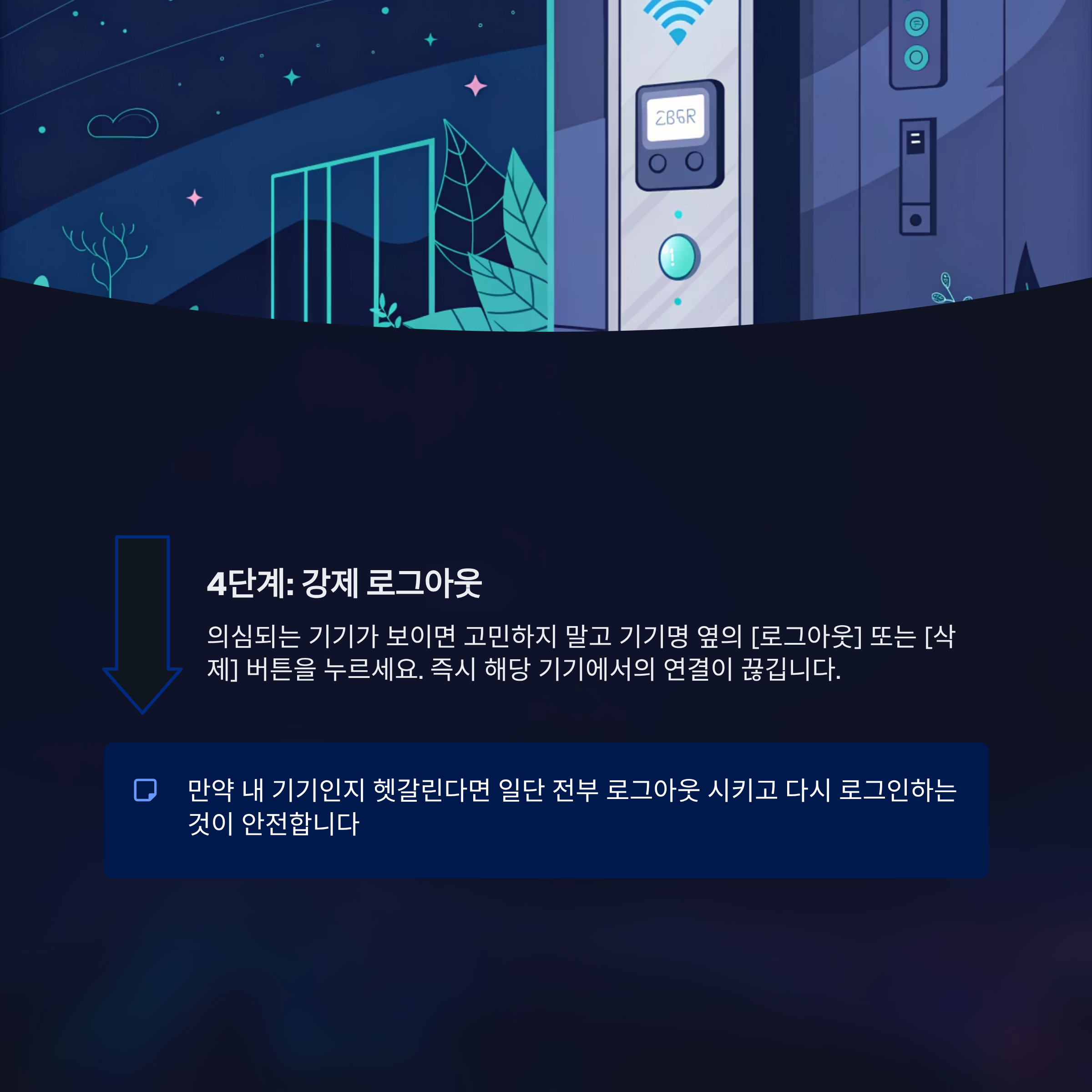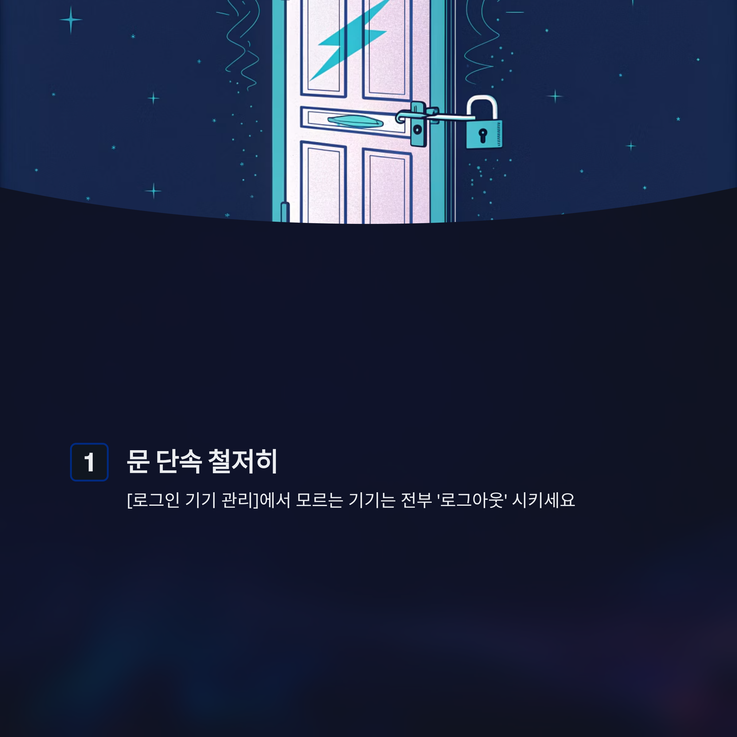 - 문 단속 철저히: [로그인 기기 관리]에서 모르는 기기는 전부 '로그아웃' 시키세요.