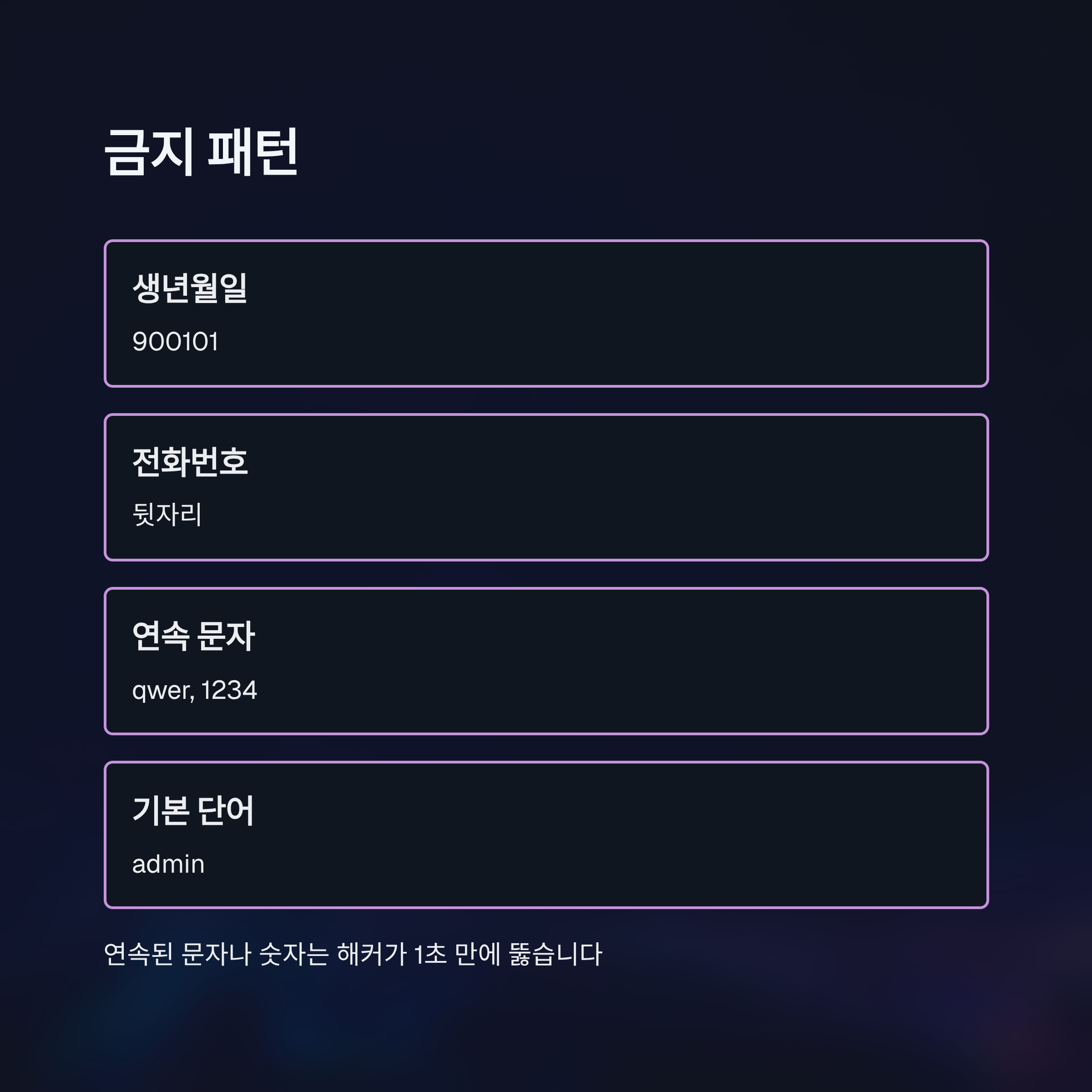 - 금지 패턴: 생년월일(900101), 전화번호 뒷자리, 'qwer', '1234', 'admin' 등 연속된 문자나 숫자는 해커가 1초 만에 뚫습니다.