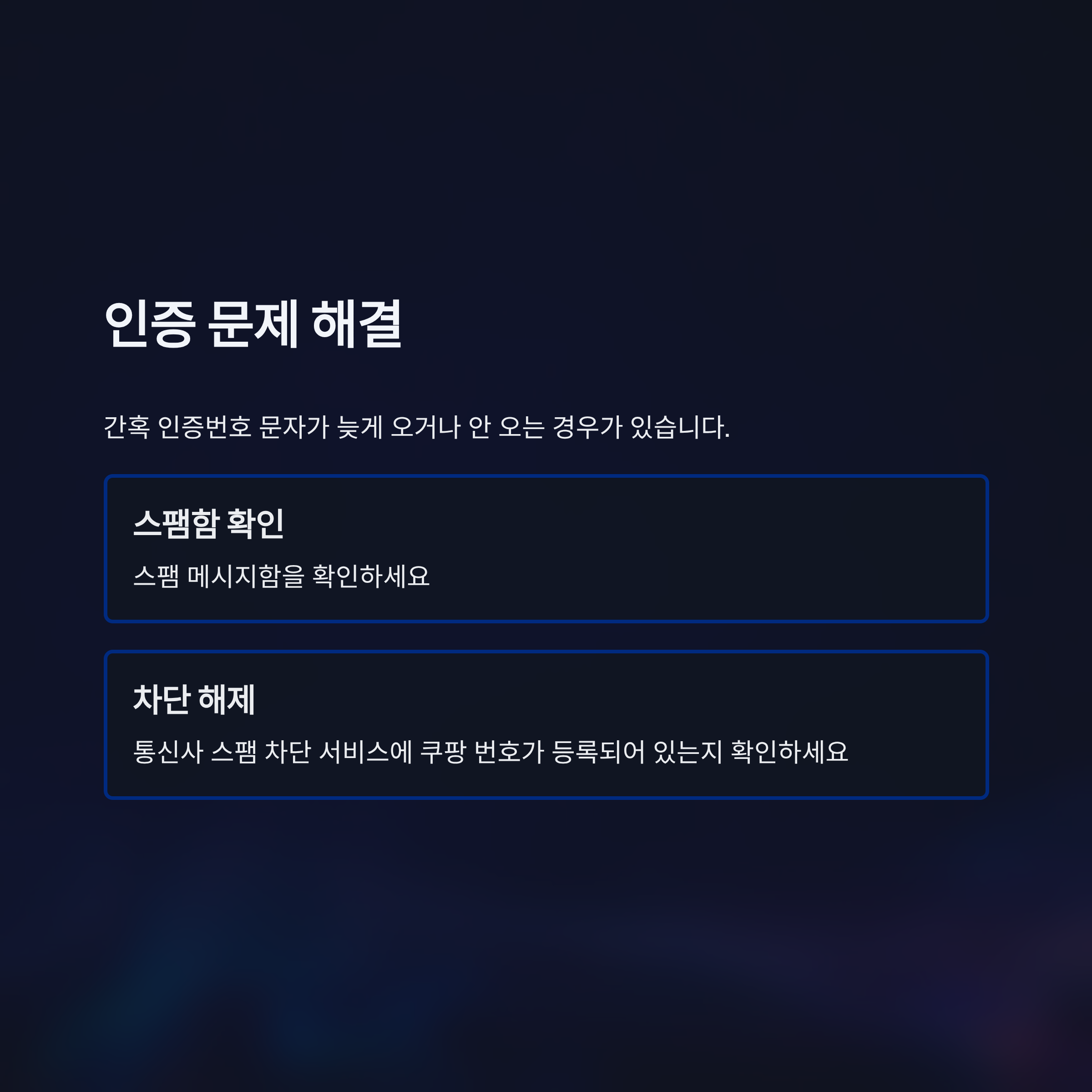 - 인증 문제 해결: 간혹 인증번호 문자가 늦게 오거나 안 오는 경우가 있습니다. 이럴 때는 스팸 메시지함을 확인하거나, 통신사 스팸 차단 서비스에 쿠팡 번호가 등록되어 있는지 확인하세요.