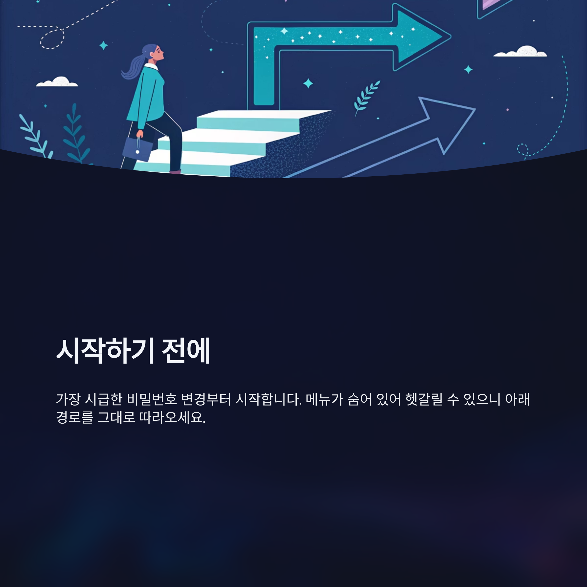 가장 시급한 비밀번호 변경부터 시작합니다. 메뉴가 숨어 있어 헷갈릴 수 있으니 아래 경로를 그대로 따라오세요.