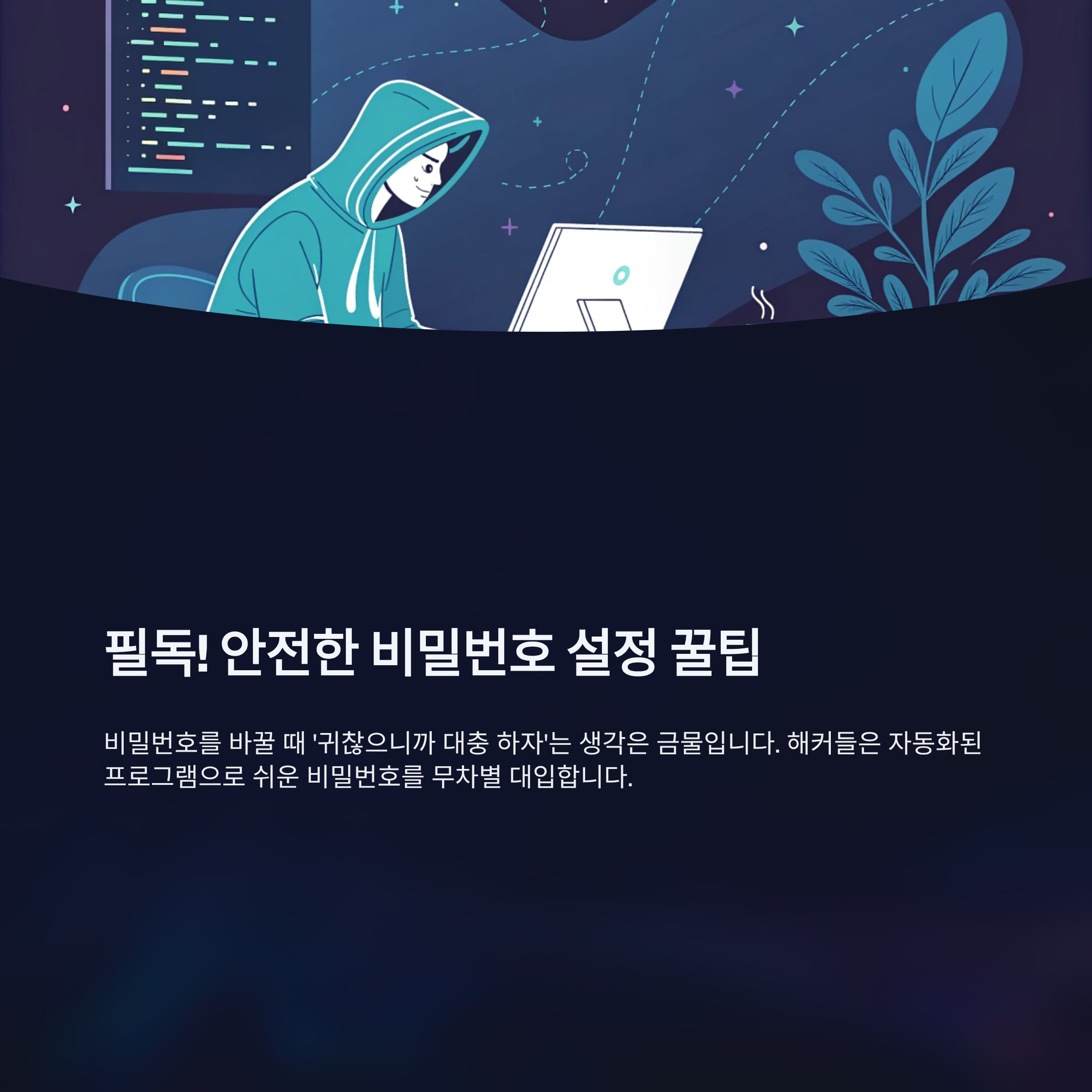 비밀번호를 바꿀 때 '귀찮으니까 대충 하자'는 생각은 금물입니다. 해커들은 자동화된 프로그램으로 쉬운 비밀번호를 무차별 대입합니다.