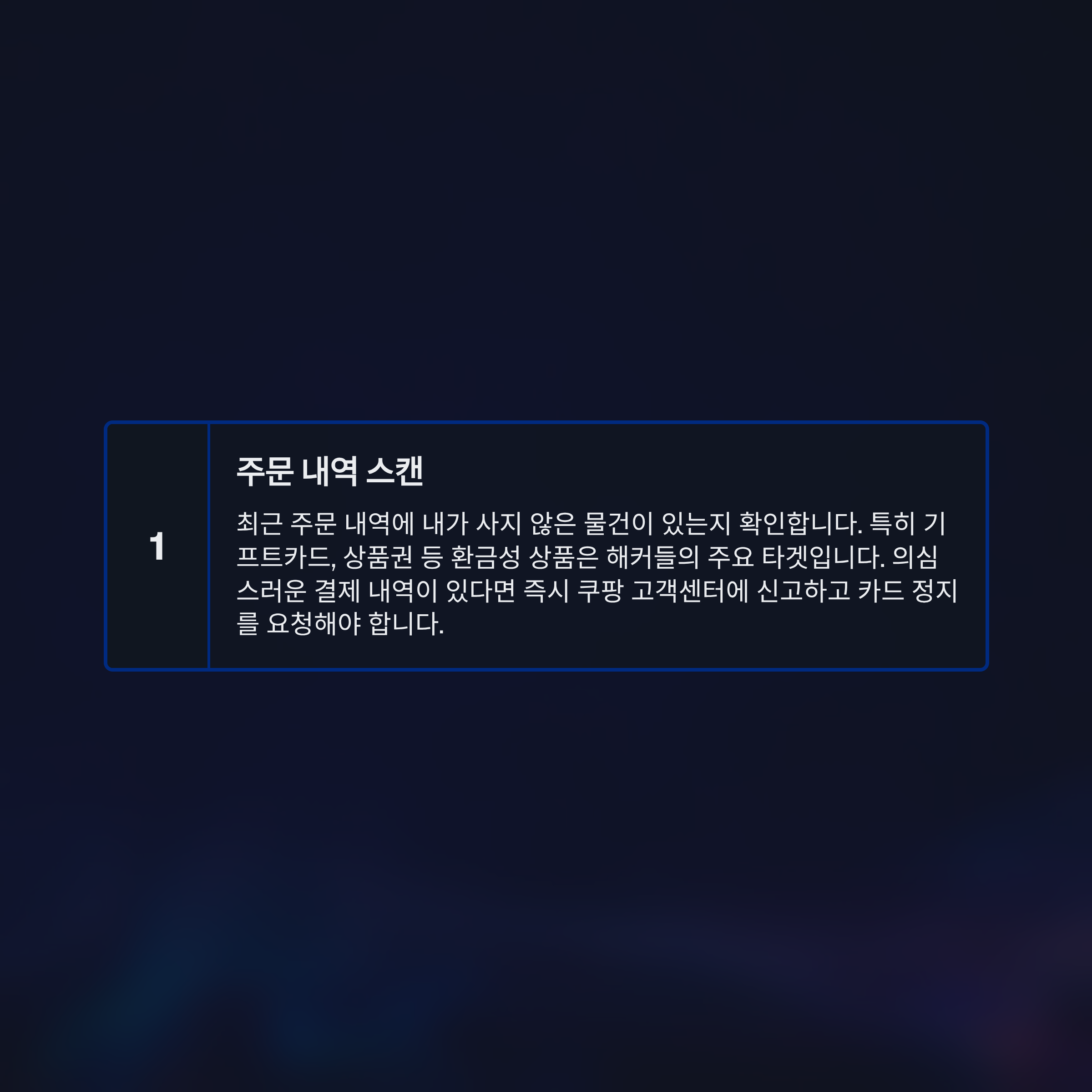- 주문 내역 스캔: 최근 주문 내역에 내가 사지 않은 물건이 있는지 확인합니다. 특히 기프트카드, 상품권 등 환금성 상품은 해커들의 주요 타겟입니다. 의심스러운 결제 내역이 있다면 즉시 쿠팡 고객센터에 신고하고 카드 정지를 요청해야 합니다.