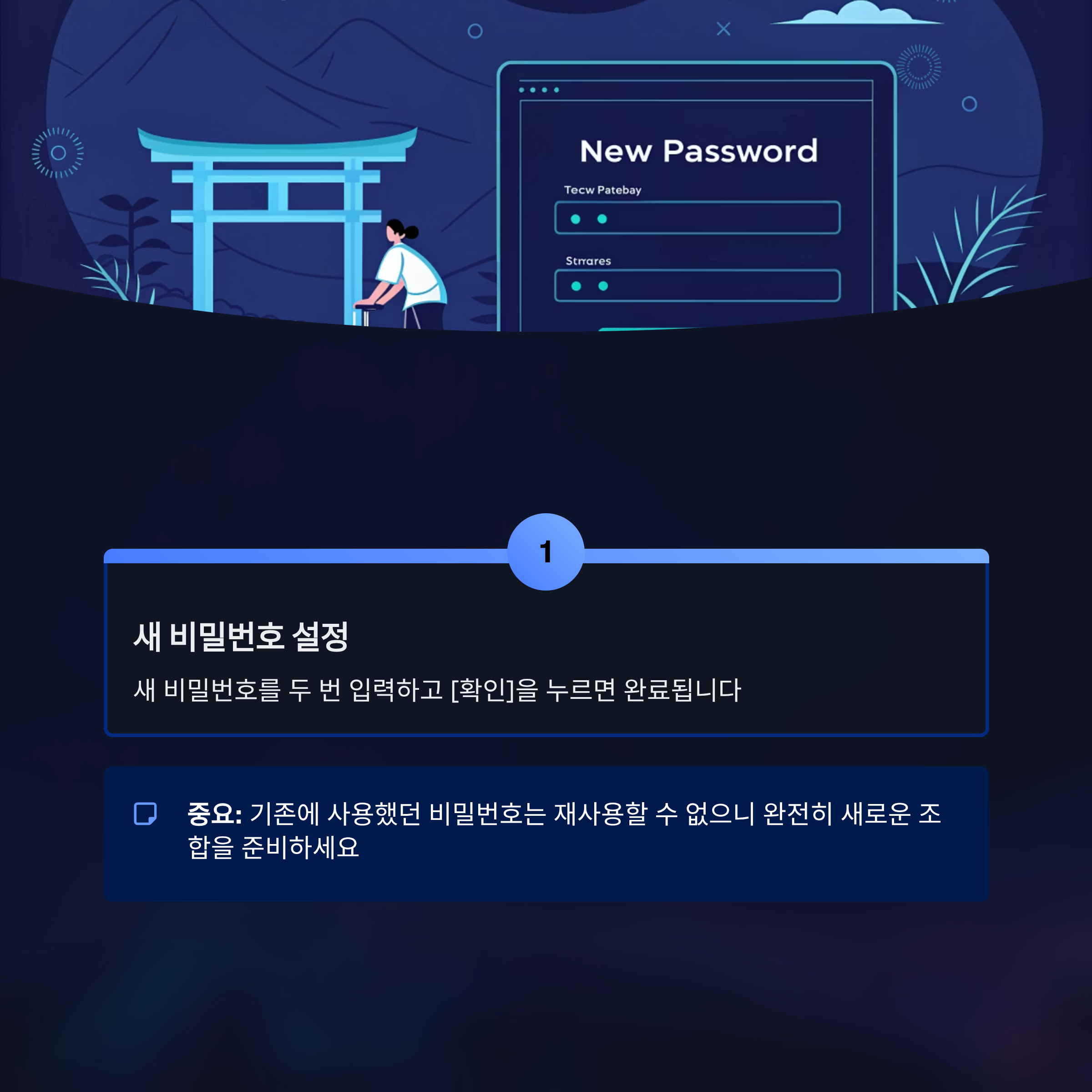 - 새 비밀번호 설정: 새 비밀번호를 두 번 입력하고 [확인]을 누르면 완료됩니다. 이때 기존에 사용했던 비밀번호는 재사용할 수 없으니 완전히 새로운 조합을 준비하세요.