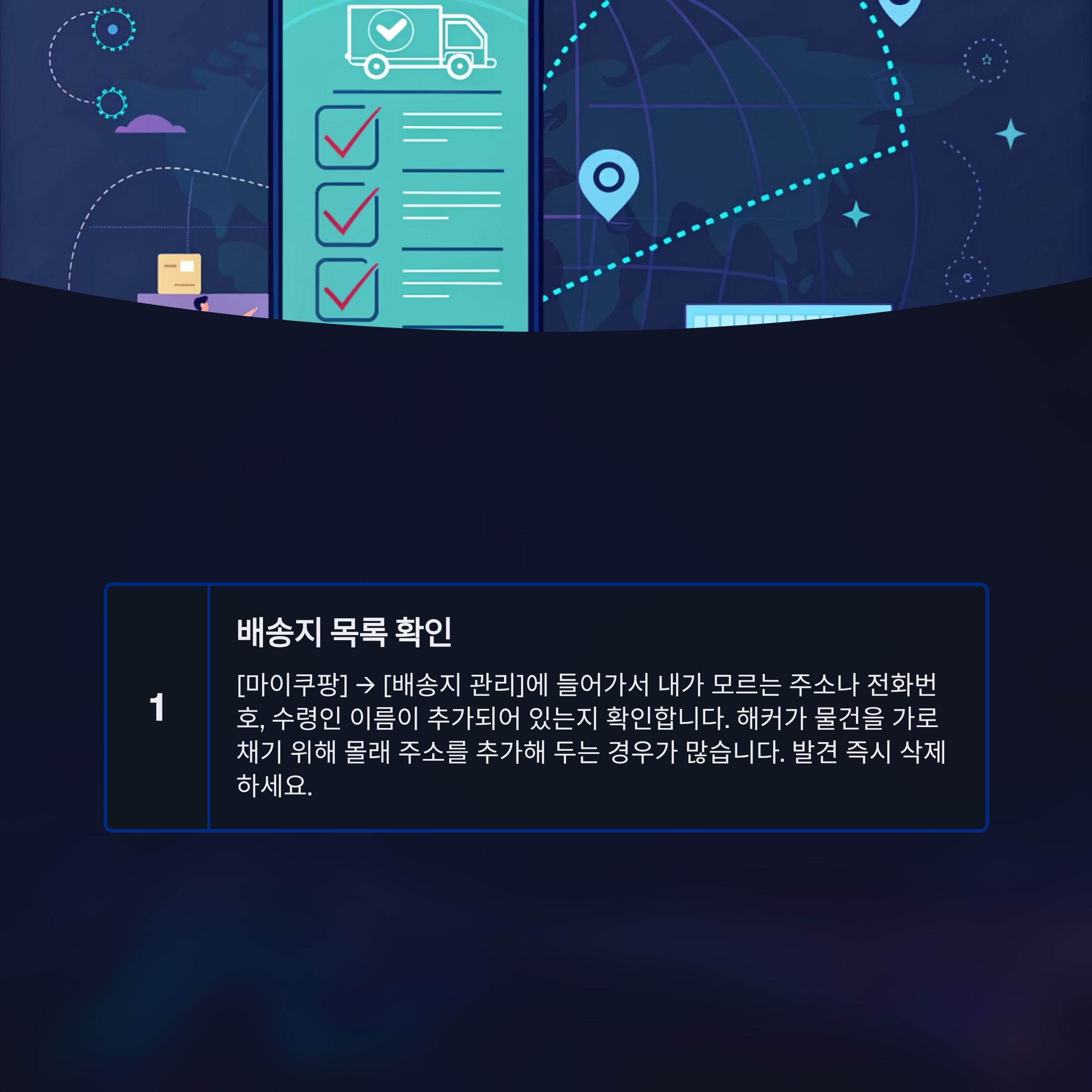 - 배송지 목록 확인: [마이쿠팡] → [배송지 관리]에 들어가서 내가 모르는 주소나 전화번호, 수령인 이름이 추가되어 있는지 확인합니다. 해커가 물건을 가로채기 위해 몰래 주소를 추가해 두는 경우가 많습니다. 발견 즉시 삭제하세요.