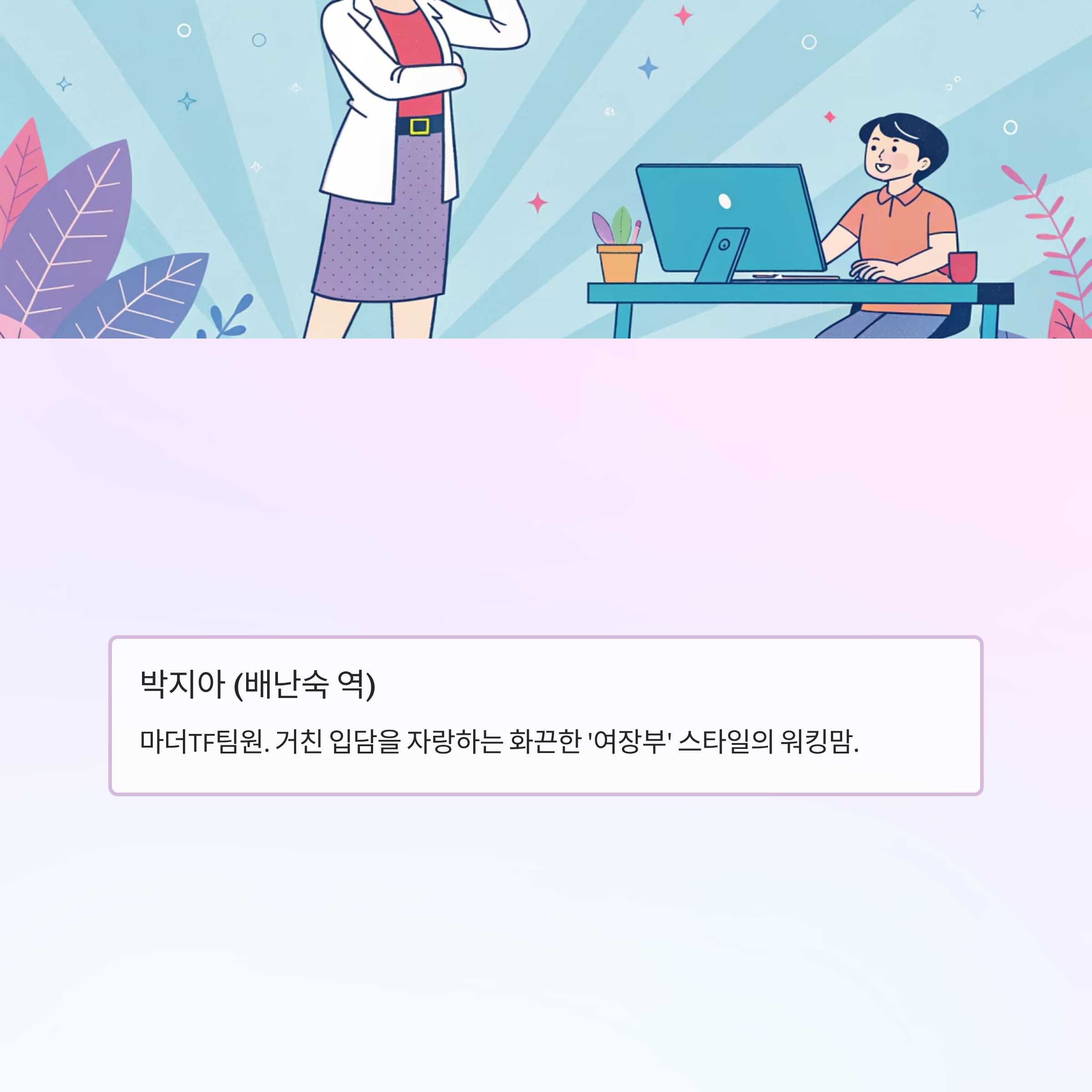 - 박지아 (배난숙 역): 마더TF팀원. 거친 입담을 자랑하는 화끈한 '여장부' 스타일의 워킹맘.