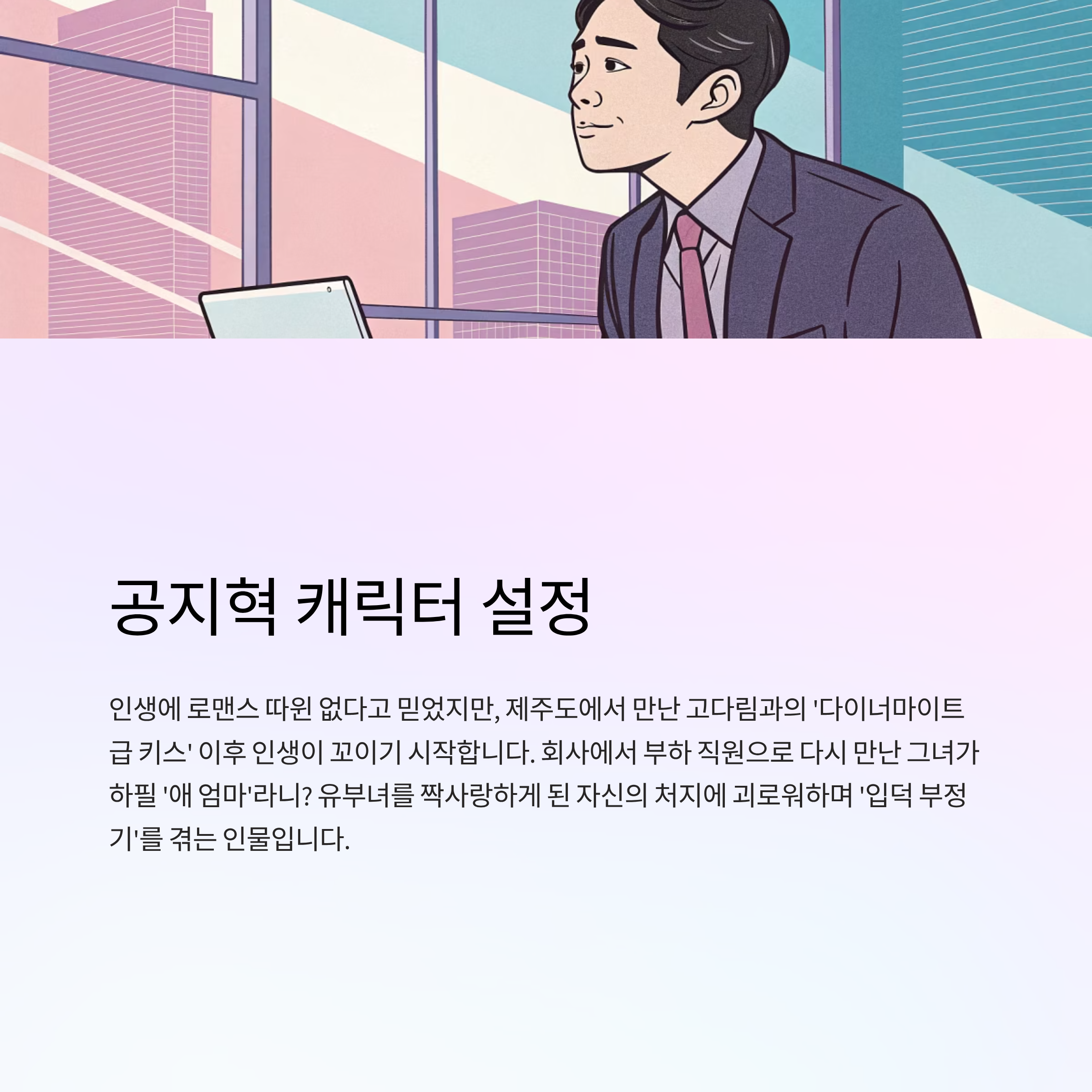 - 설정: 인생에 로맨스 따윈 없다고 믿었지만, 제주도에서 만난 고다림과의 '다이너마이트급 키스' 이후 인생이 꼬이기 시작합니다. 회사에서 부하 직원으로 다시 만난 그녀가 하필 '애 엄마'라니? 유부녀를 짝사랑하게 된 자신의 처지에 괴로워하며 '입덕 부정기'를 겪는 인물입니다.
