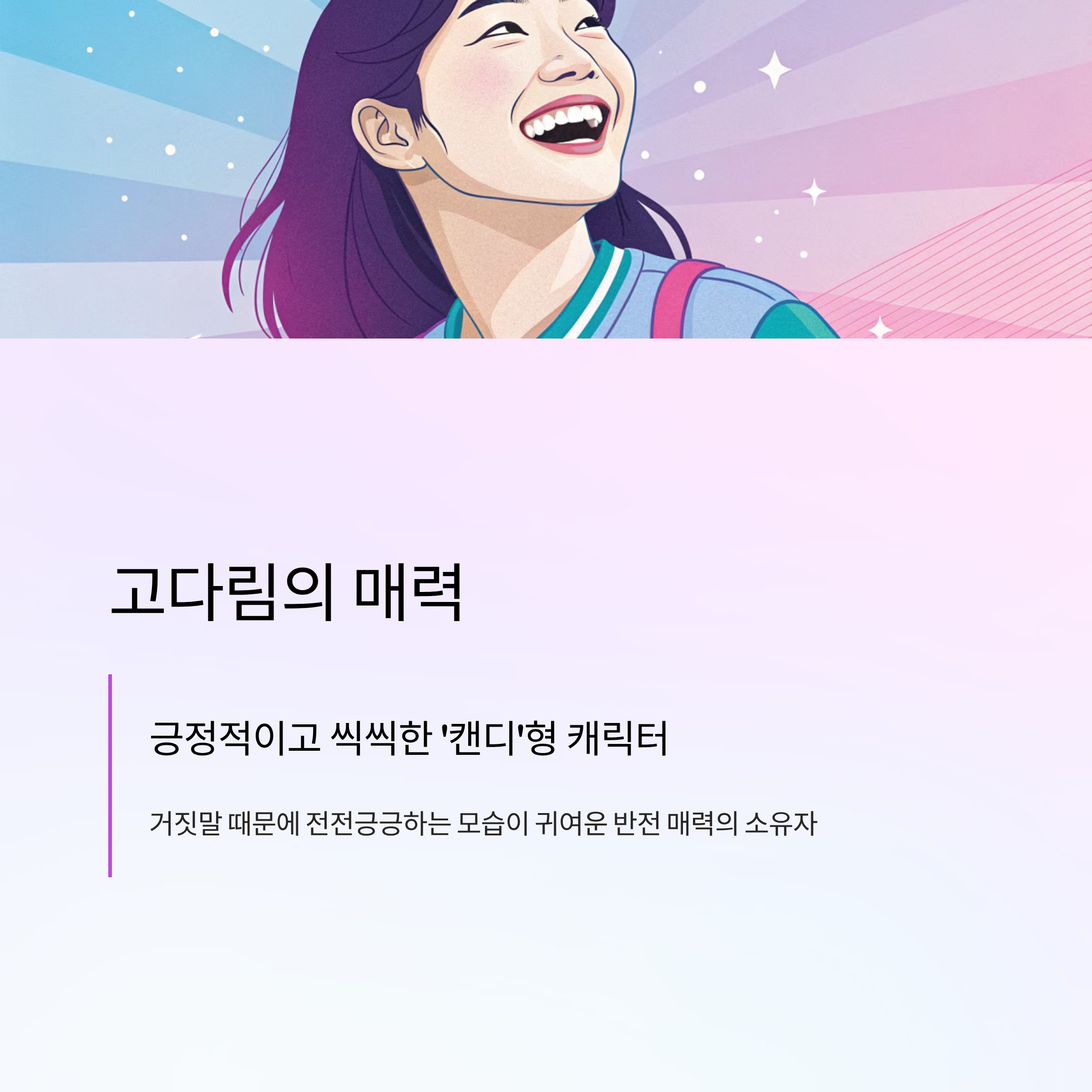 - 매력: 긍정적이고 씩씩한 '캔디'형 캐릭터지만, 거짓말 때문에 전전긍긍하는 모습이 귀여운 반전 매력의 소유자.