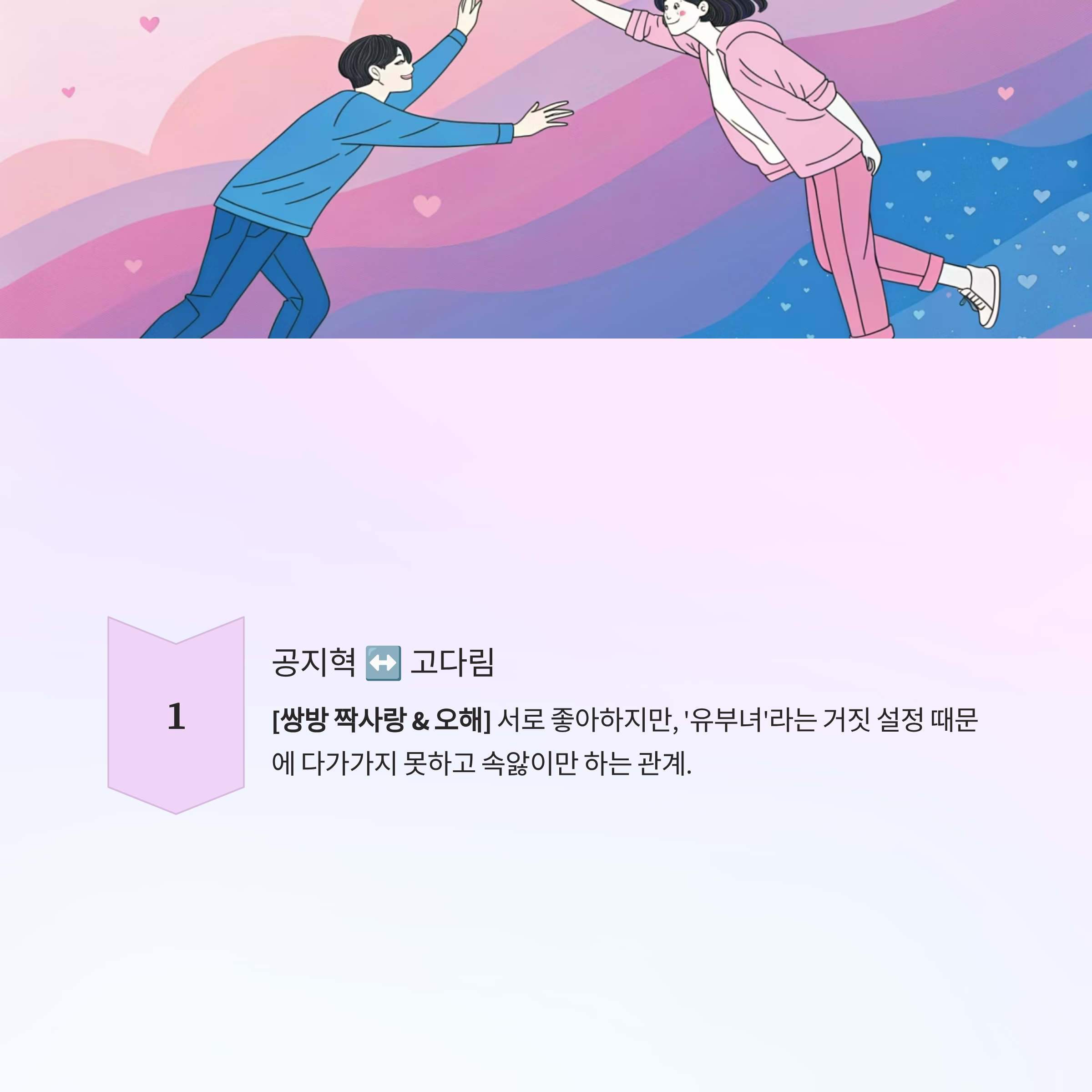 - 공지혁 ↔ 고다림: [쌍방 짝사랑 & 오해] 서로 좋아하지만, '유부녀'라는 거짓 설정 때문에 다가가지 못하고 속앓이만 하는 관계.