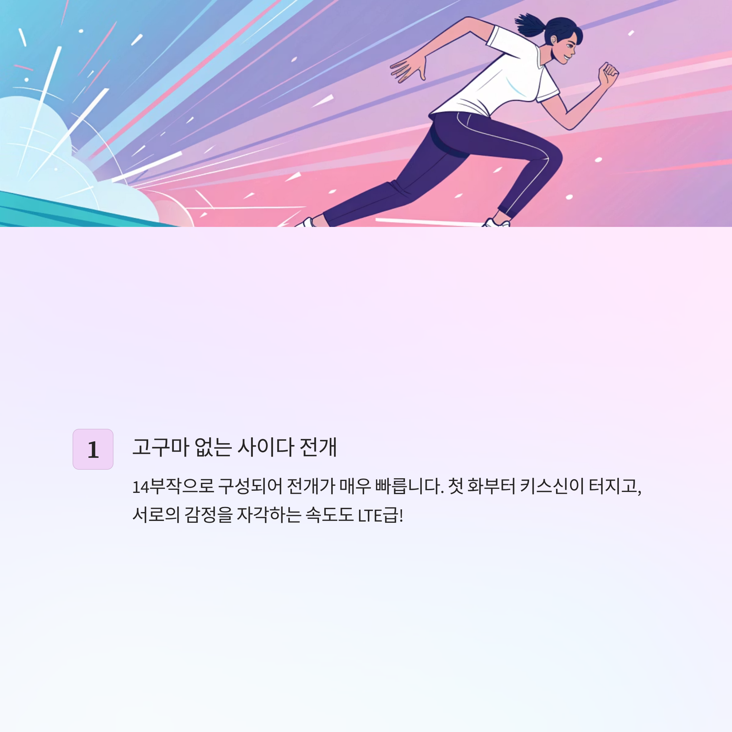 - 고구마 없는 사이다 전개: 14부작으로 구성되어 전개가 매우 빠릅니다. 첫 화부터 키스신이 터지고, 서로의 감정을 자각하는 속도도 LTE급!