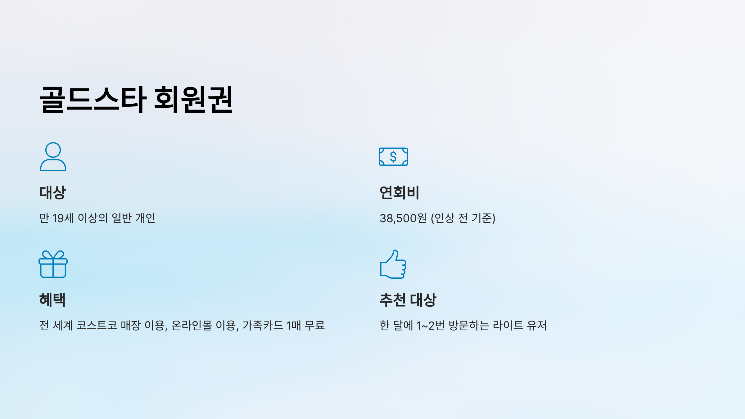 - 혜택: 전 세계 코스트코 매장 이용 가능, 온라인몰 이용 가능, 가족카드 1매 무료 발급