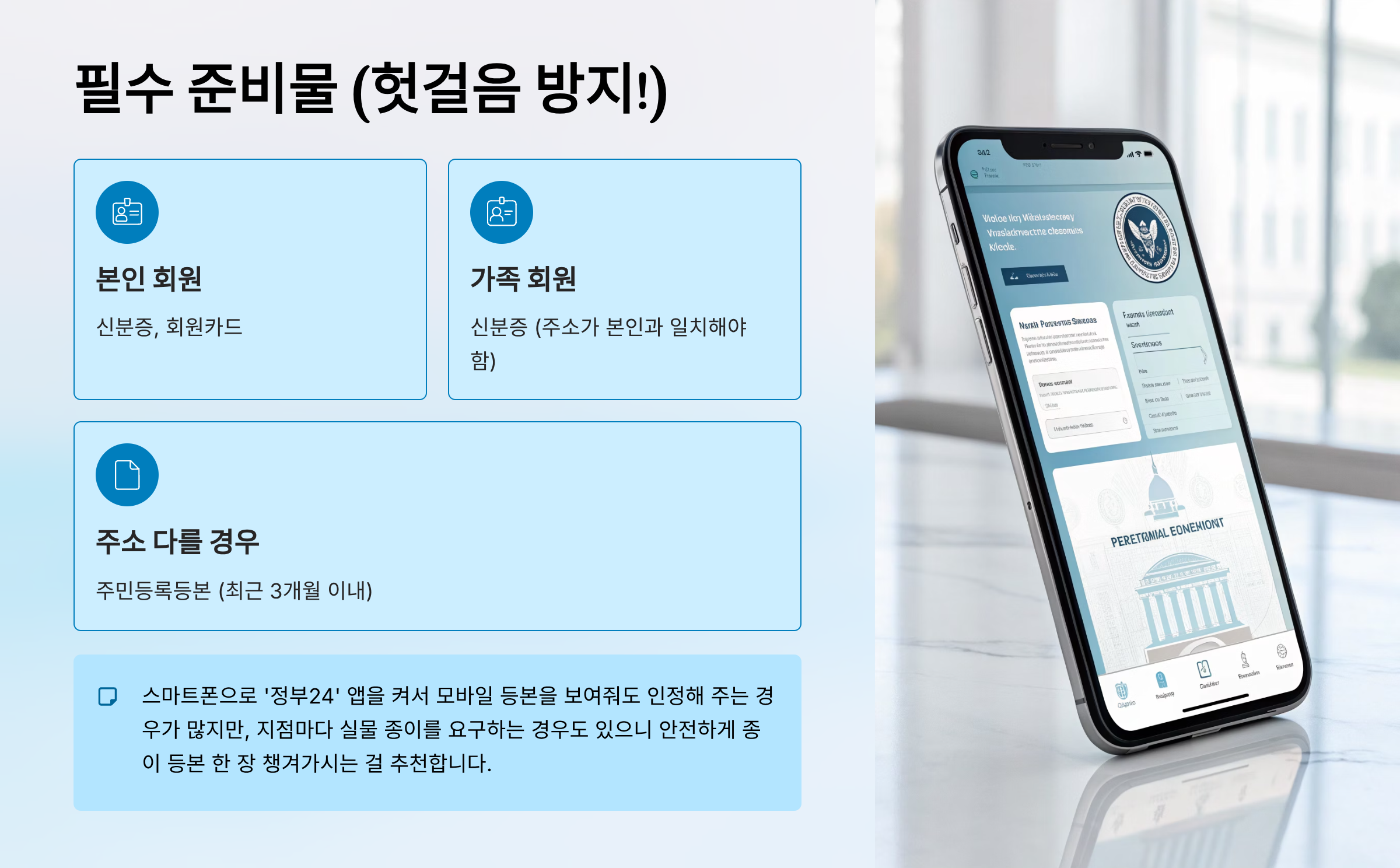 - 가족 회원: 신분증 (주소가 본인과 일치해야 함)