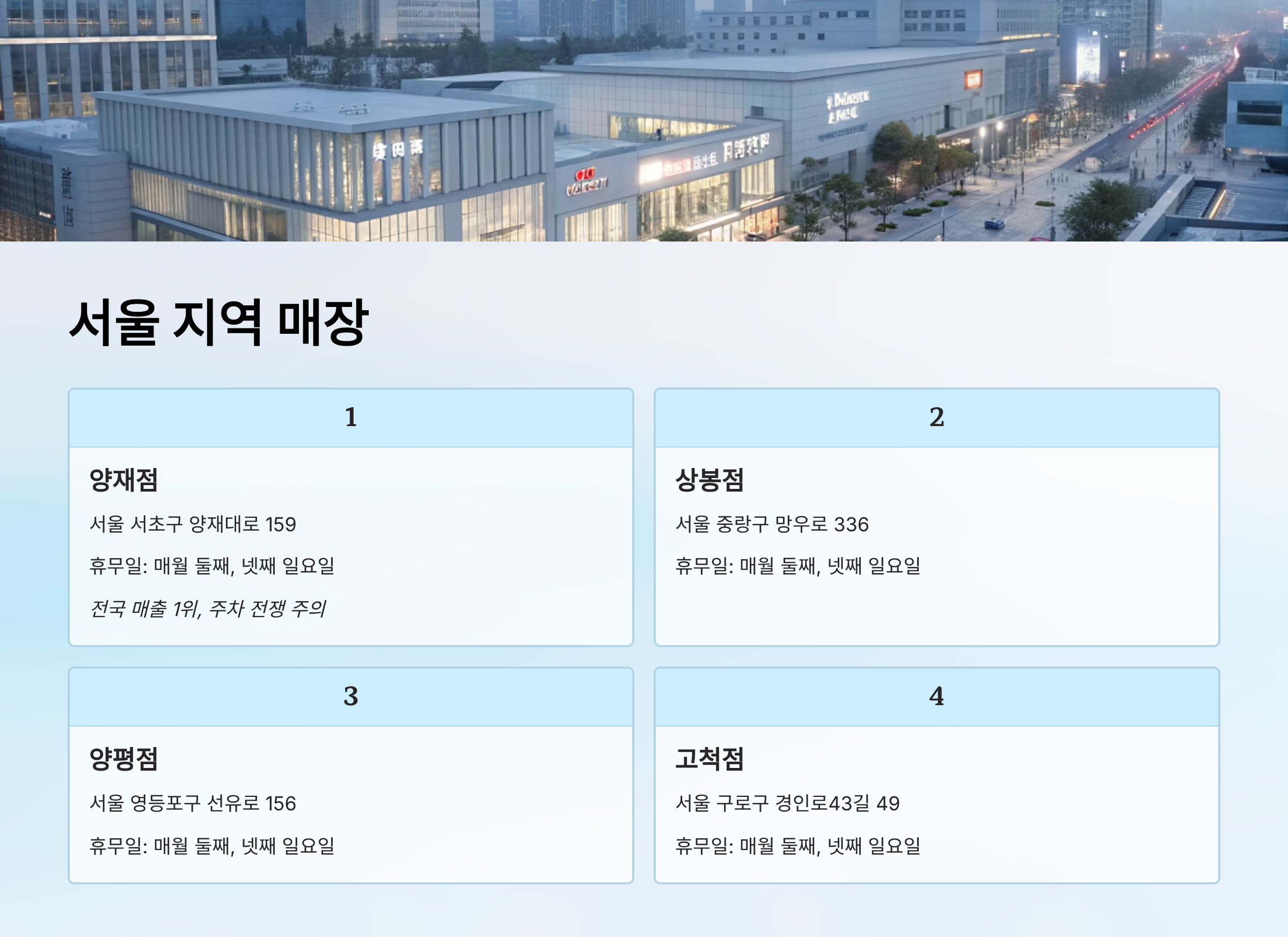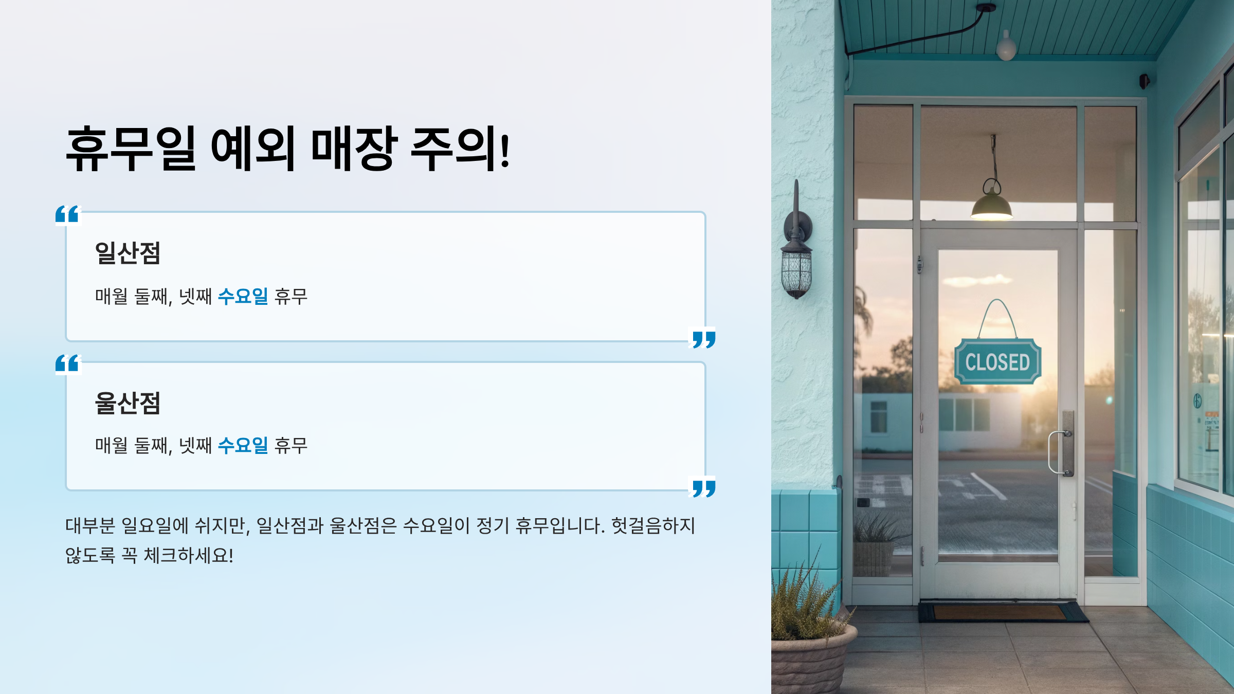 대부분 일요일에 쉬지만, 일산점과 울산점은 매월 둘째, 넷째 수요일이 정기 휴무입니다. 헛걸음하지 않도록 꼭 체크하세요!