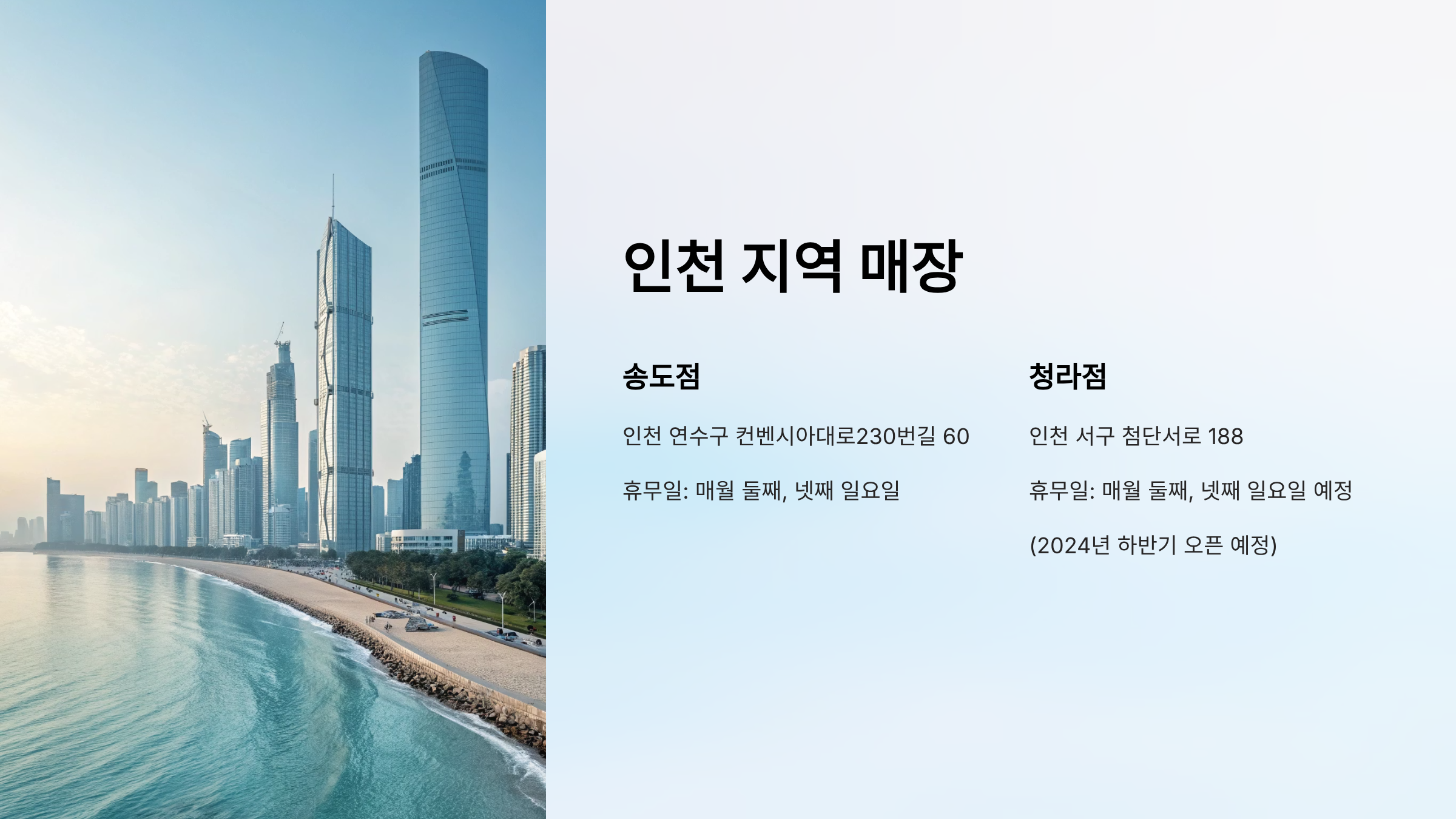- 청라점: 인천 서구 첨단서로 188 (2024년 하반기 오픈 예정)