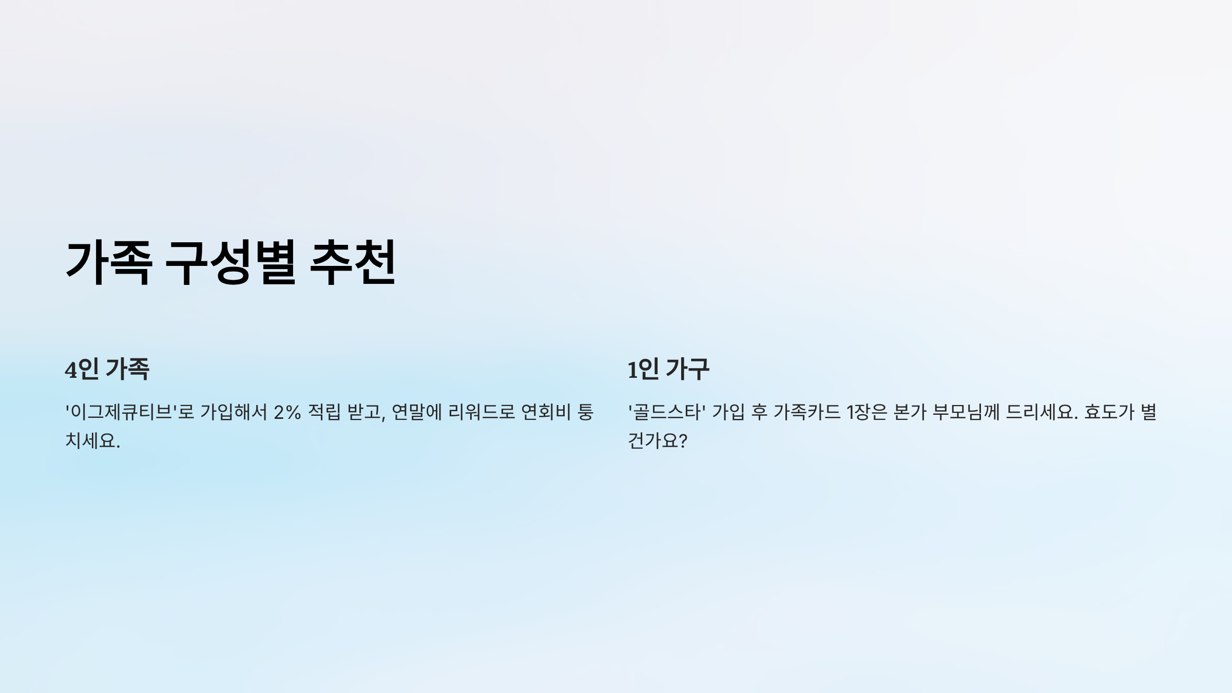- 4인 가족이라면: '이그제큐티브'로 가입해서 2% 적립 받고, 연말에 리워드로 연회비 퉁치세요.