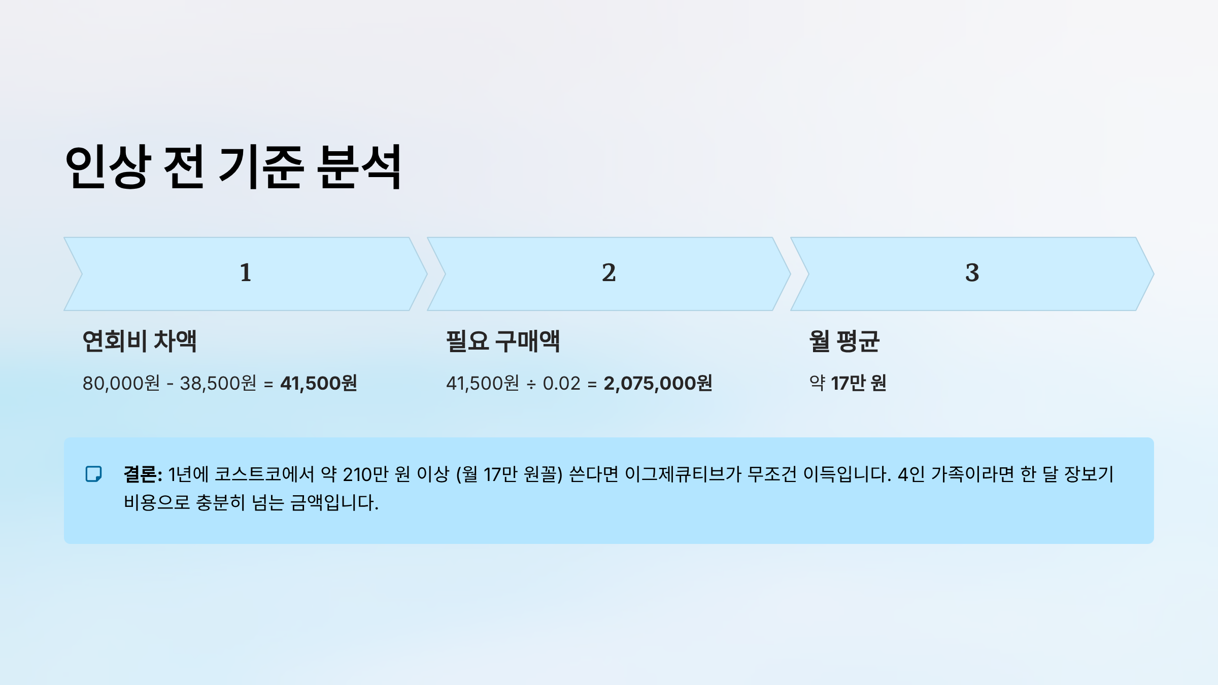 - 결론: 1년에 코스트코에서 약 210만 원 이상 (월 17만 원꼴) 쓴다면 이그제큐티브가 무조건 이득입니다. 4인 가족이라면 한 달 장보기 비용으로 충분히 넘는 금액이죠?