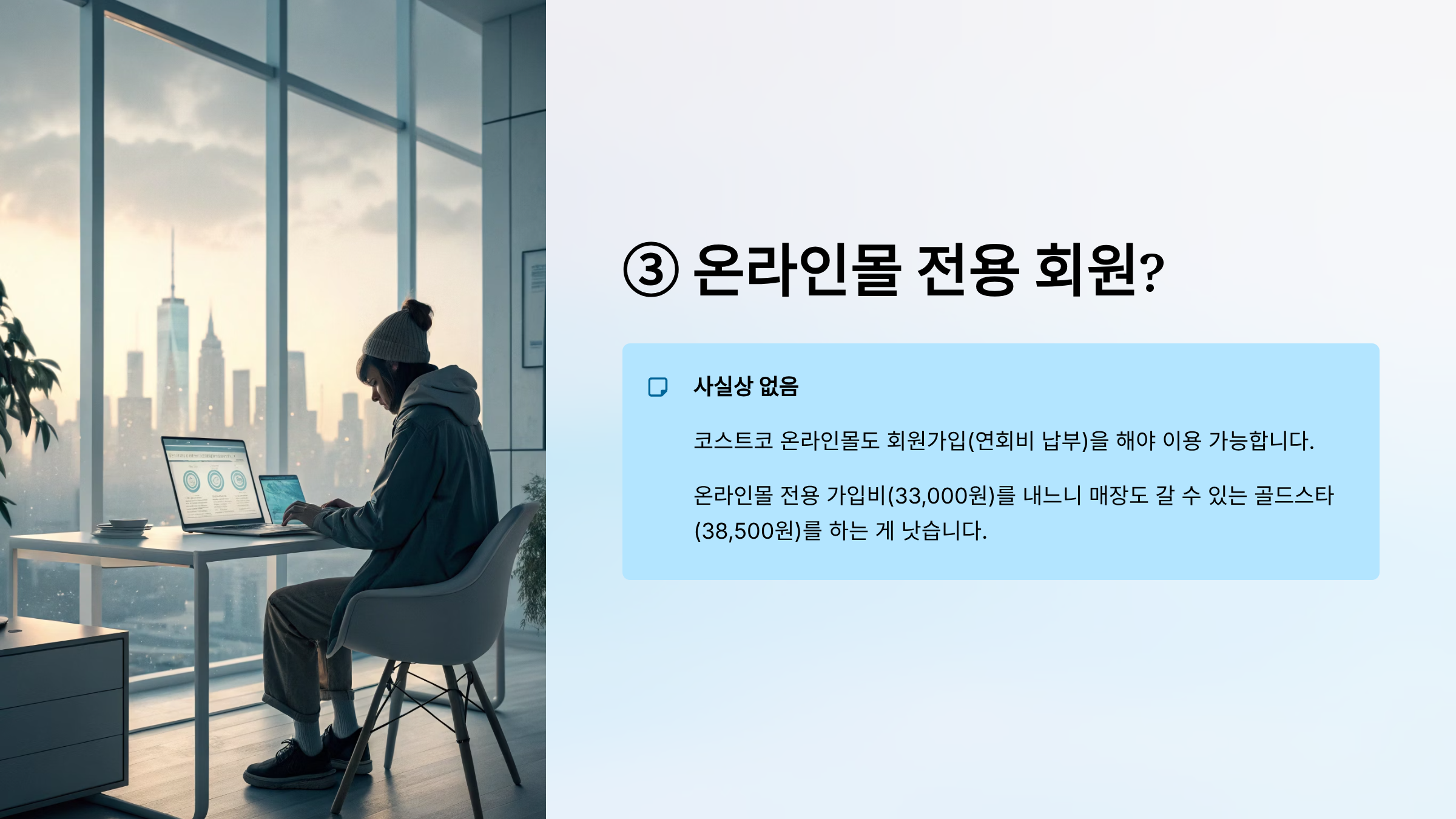 코스트코 온라인몰도 회원가입(연회비 납부)을 해야 이용 가능합니다. 하지만 온라인몰 전용 가입비(33,000원)를 내느니 매장도 갈 수 있는 골드스타(38,500원)를 하는 게 낫습니다.